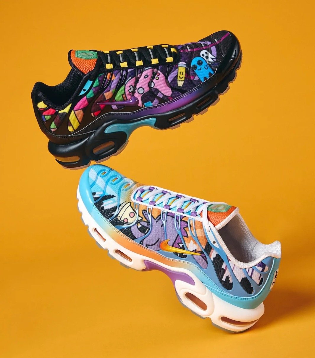 創造性、個性、そしてあらゆる楽しみからインスピレーションを得たナイキ エア マックス プラス “セルジオ”は、昼も夜も楽しめる遊び心あふれるシルエットだ。ビデオゲームファンであり、絵を描くこととバスケットボールも愛するセルジオは、カラフルなキャラクターでミスマッチなペアをデザインした。ブラックのシューズは、コントローラーのグラフィックとカラフルなボタンのような穴がアウトソールにあしらわれ、彼のゲームへの情熱を表現している。もう片方のスニーカーは白を基調とし、ニューヨークのスカイラインを背景にピザを食べるモンスターリザードが描かれている。
