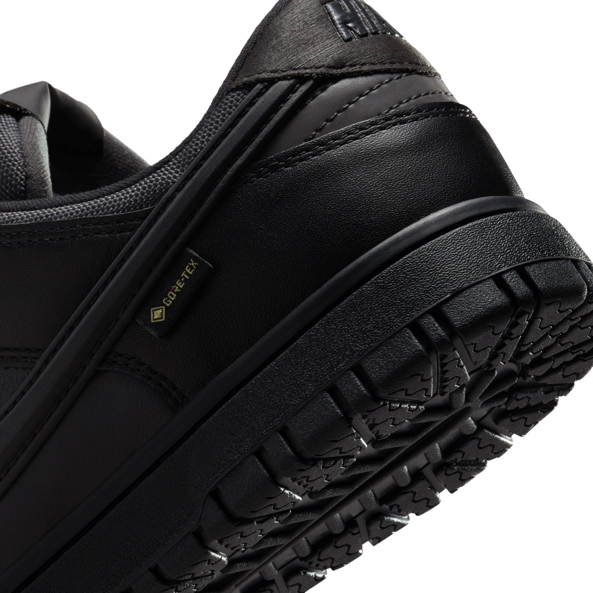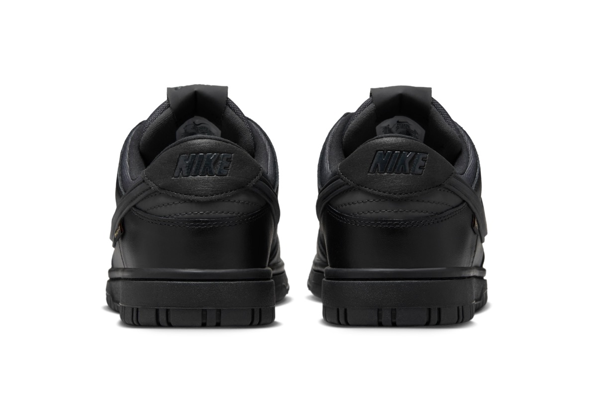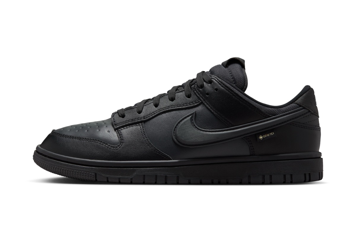 1985年に初めて発売されたナイキの「ダンク(Dunk)」。今回登場する新作は、アッパー裏地に防水透湿性素材(ぼうすいとうしつせいそざい)である「Gore-Tex®︎(ゴアテックス)」ファブリクスを採用したローカットの全天候型シューズ。レザー素材の表地にはオールブラックのカラーリングを落とし込み、トゥボックスのベンチレーションホールなどは塞ぐことで、雨が染み込まないよう、防水性の高いディテールが施されている。