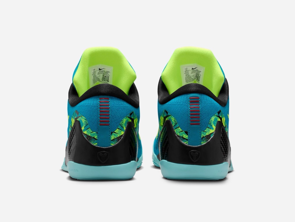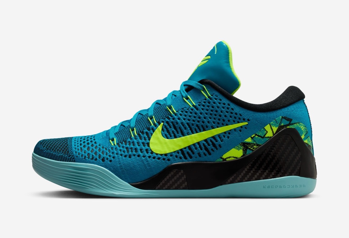 今回登場するのは、2014年に発売されたハイカット仕様の Kobe 9 Elite “Perspective”の鮮やかなネオターコイズとボルトの配色を、ローカットモデルに落とし込んだ一足。アッパーはフライニット素材で軽量かつ通気性に優れ、シューレースのロックインケーブルが、シューレースを締める際に足中央部にしっかりとフィット。取り外し可能なナイキ リアクト フォーム ソックライナーが反発力のあるクッショニングを提供し、足がコートと一体になっている感覚を味わうことが可能。耐久性に優れたトラクション圧力マッピング設計の最小限のラバーアウトソールは、耐久性に優れたトラクションを提供し、足の自然な輪郭を模倣している。