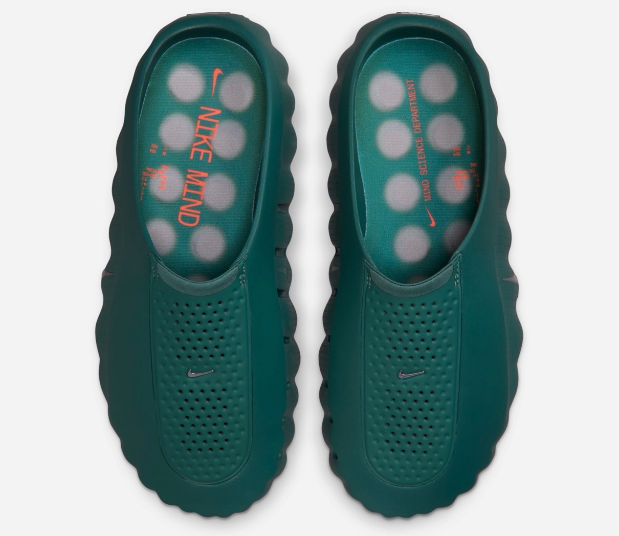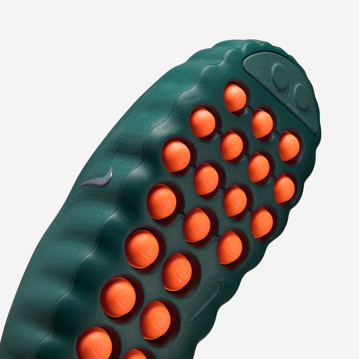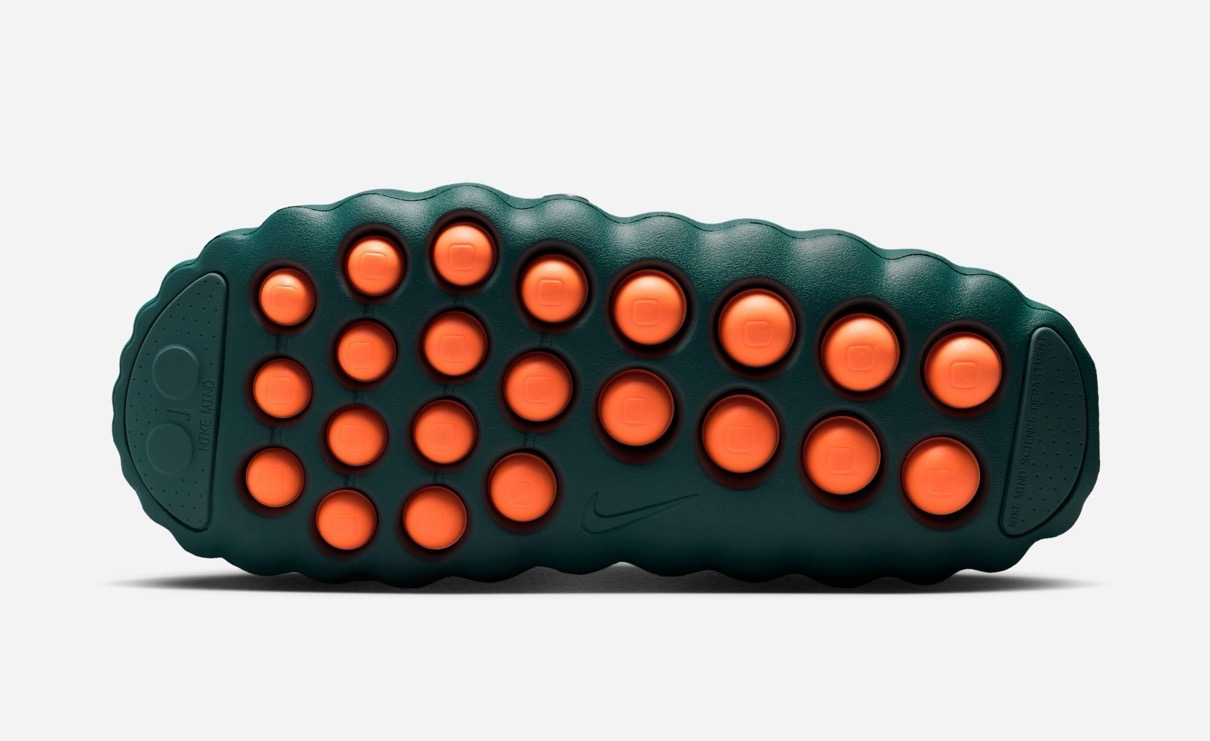 今回登場する近未来的シルエット『Mind 001』は、ナイキの最新リカバリーサンダル。新鮮でコンセプチュアルなアプローチをもたらすこの新型モデルは、アグレッシブなパフォーマンスランニングシューズとは明らかに一線を画し、静謐で瞑想的な美学に焦点を当てている。ミニマルな構造を体現したデザインは、クリーンで流線型のシルエット、二部構成のビルド、洗練された彫刻的な質感が特徴。大きめのアウトソールの突起が一歩踏み込むたびに足を刺激。脳の感覚領域を活性化することでその瞬間に集中しやすくなり、周囲とのつながりを感じられる。勝ち負けが予測できない試合ほど、最後に勝敗を分けるのはマインドセットなのだ。ミネラルスレートグリーンのアッパーは軽量で通気性に優れたパーフォレーション加工素材を採用し、縦に配されたメタルスウッシュとオレンジの突起がアクセントとなっている。