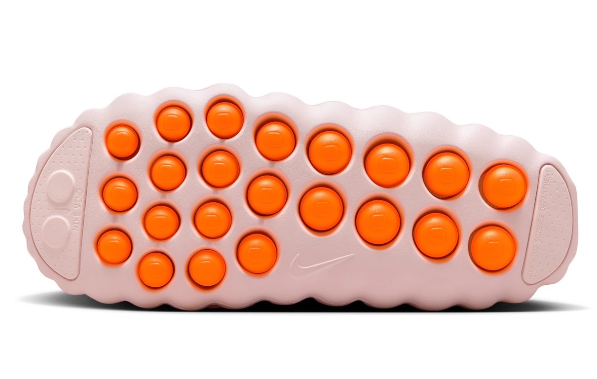 今回登場する近未来的シルエット『Mind 001』は、ナイキの最新リカバリーサンダル。新鮮でコンセプチュアルなアプローチをもたらすこの新型モデルは、アグレッシブなパフォーマンスランニングシューズとは明らかに一線を画し、静謐で瞑想的な美学に焦点を当てている。ミニマルな構造を体現したデザインは、クリーンで流線型のシルエット、二部構成のビルド、洗練された彫刻的な質感が特徴。大きめのアウトソールの突起が一歩踏み込むたびに足を刺激。脳の感覚領域を活性化することでその瞬間に集中しやすくなり、周囲とのつながりを感じられる。勝ち負けが予測できない試合ほど、最後に勝敗を分けるのはマインドセットなのだ。パールピンクのアッパーは軽量で通気性に優れたパーフォレーション加工素材を採用し、縦に配されたメタルスウッシュとハイパークリムゾンオレンジの突起がアクセントとなっている。