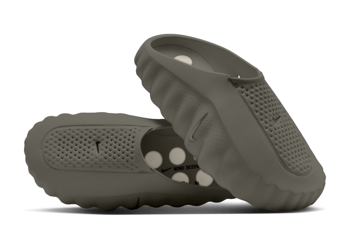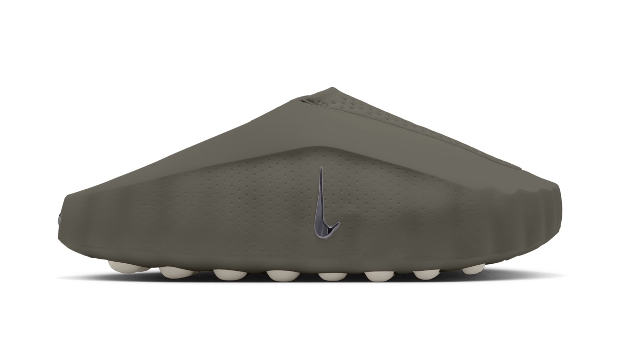 今回登場する近未来的シルエット『Mind 001』は、ナイキの最新リカバリーサンダル。新鮮でコンセプチュアルなアプローチをもたらすこの新型モデルは、アグレッシブなパフォーマンスランニングシューズとは明らかに一線を画し、静謐で瞑想的な美学に焦点を当てている。ミニマルな構造を体現したデザインは、クリーンで流線型のシルエット、二部構成のビルド、洗練された彫刻的な質感が特徴。大きめのアウトソールの突起が一歩踏み込むたびに足を刺激。脳の感覚領域を活性化することでその瞬間に集中しやすくなり、周囲とのつながりを感じられる。勝ち負けが予測できない試合ほど、最後に勝敗を分けるのはマインドセットなのだ。タープグリーンのアッパーは軽量で通気性に優れたパーフォレーション加工素材を採用し、縦に配されたメタルスウッシュとライトオールウッドブラウンの突起がアクセントとなっている。
