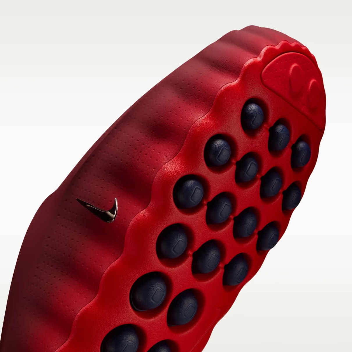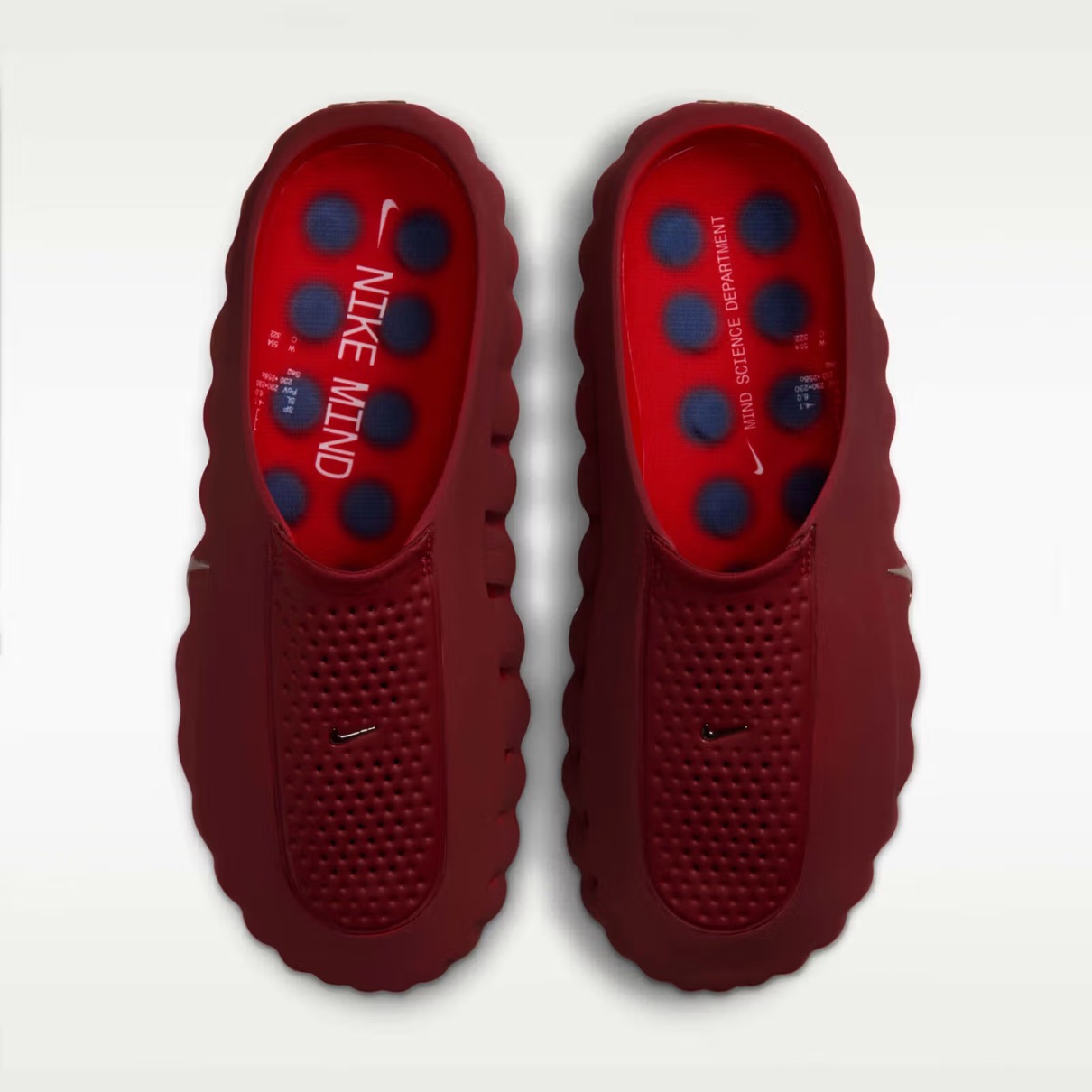 今回登場する近未来的シルエット『Mind 001』は、ナイキの最新リカバリーサンダル。新鮮でコンセプチュアルなアプローチをもたらすこの新型モデルは、アグレッシブなパフォーマンスランニングシューズとは明らかに一線を画し、静謐で瞑想的な美学に焦点を当てている。ミニマルな構造を体現したデザインは、クリーンで流線型のシルエット、二部構成のビルド、洗練された彫刻的な質感が特徴。大きめのアウトソールの突起が一歩踏み込むたびに足を刺激。脳の感覚領域を活性化することでその瞬間に集中しやすくなり、周囲とのつながりを感じられる。勝ち負けが予測できない試合ほど、最後に勝敗を分けるのはマインドセットなのだ。チームレッドとユニバーシティレッドのグラデーションアッパーは軽量で通気性に優れたパーフォレーション加工素材を採用し、縦に配されたメタルスウッシュとブラックの突起がアクセントとなっている。