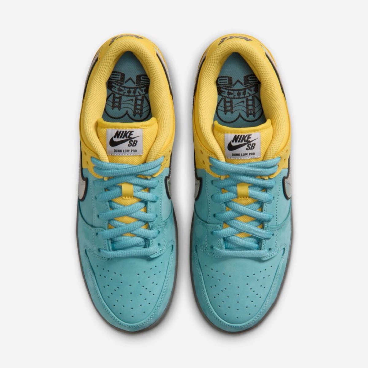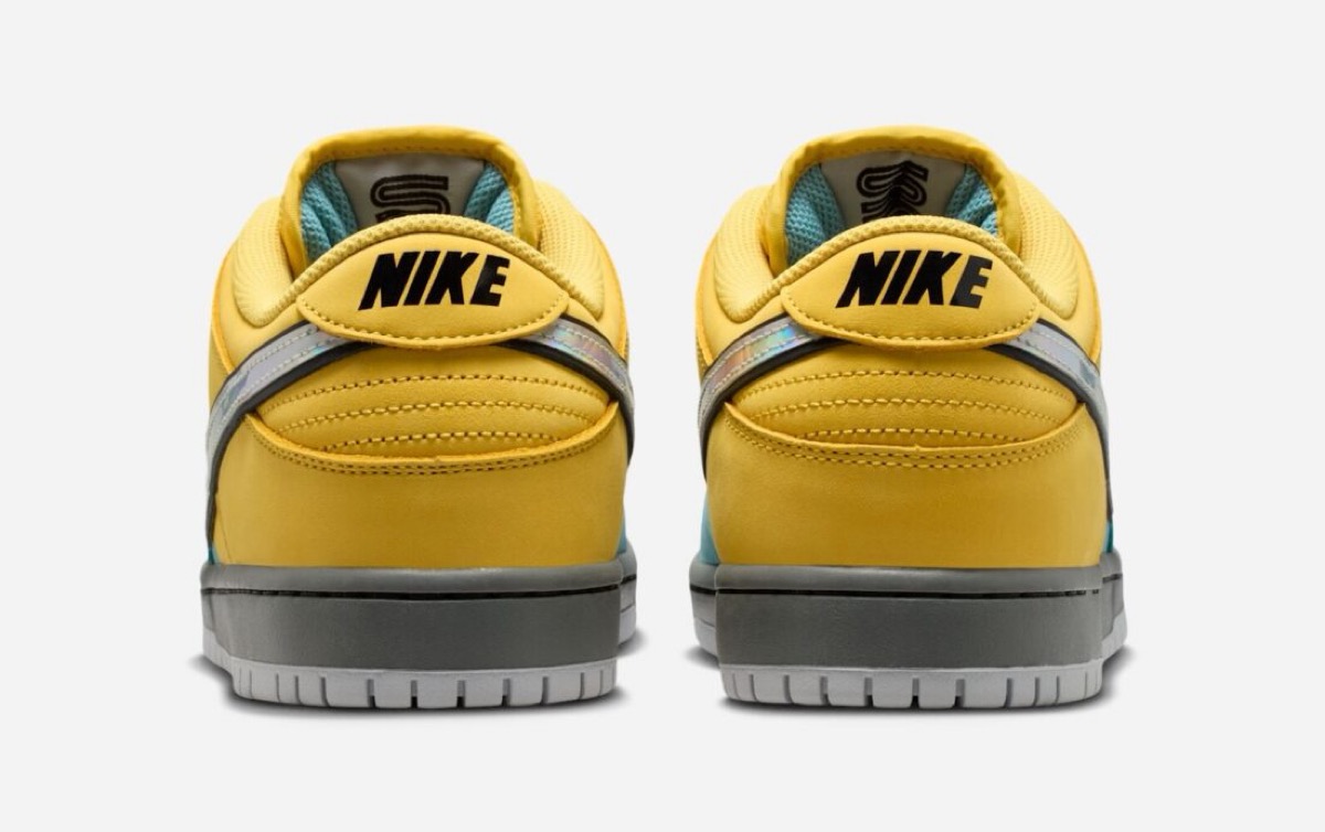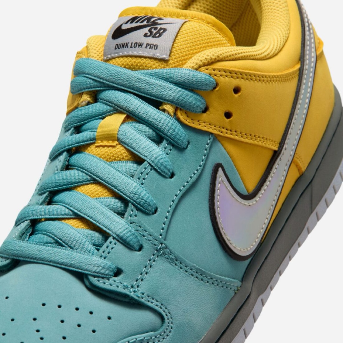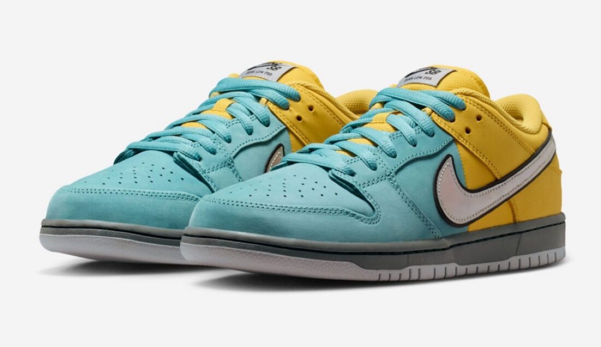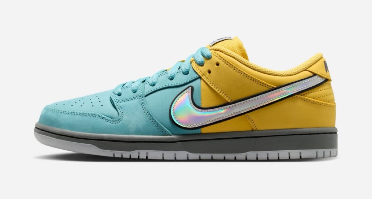 人気スニーカー「ダンク(Dunk)」のローカットSBモデルに新作が登場。このシューズはスウェード素材で構築したアッパーの後足部がライトニングイエロー、前足部がデニムターコイズブルーのスプリットデザイン。サイドのスウッシュはグレーで、ミッドソールはブラックカラーで引き締めている。なお、このペアのインスピレーション源は、1994年から2014年までサンフランシスコ市営鉄道(英語: San Francisco Municipal Railway 通称 Muni)で使用されていたMuni Fast PassのDec. 2008 カラーであり、カラーの異なるもう1ペアも既に登場。インソールにはサンフランシスコを象徴するゴールデンゲートブリッジのグラフィックがプリントされている。