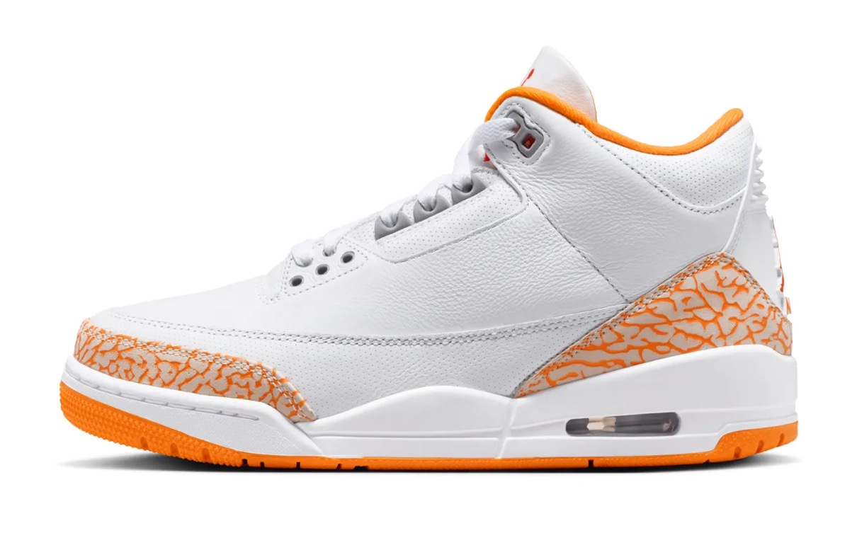 伝説的シューズデザイナー Tinker Hatfield(ティンカー・ハットフィールド)がデザインを手がけ、1988年に初登場したモデル「Air Jordan 3(エアジョーダン3)」。今作ではアッパーをホワイトカラーのレザー素材で構築し、エレファント柄の補強パーツやライナーにはオレンジシトラス、シュータンとヒールのジャンプマンロゴにはファイヤーレッドのアクセントをプラスしている。