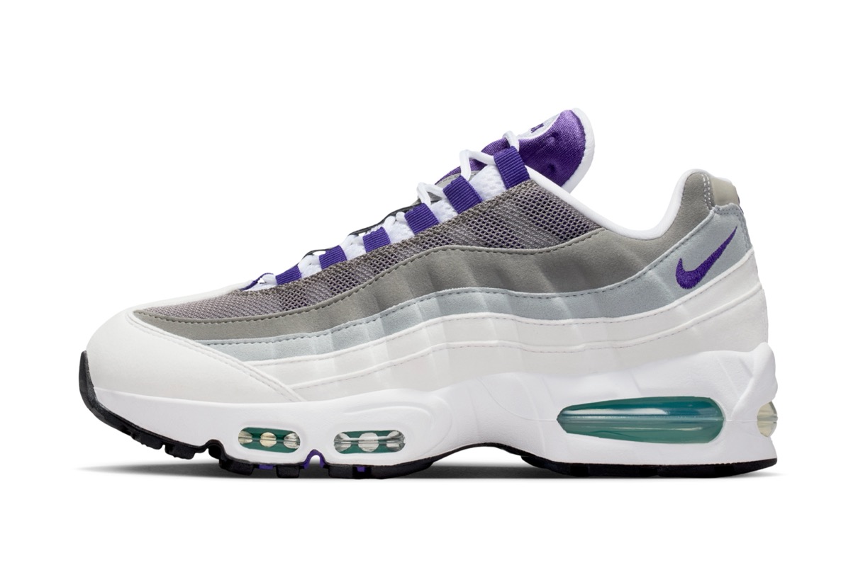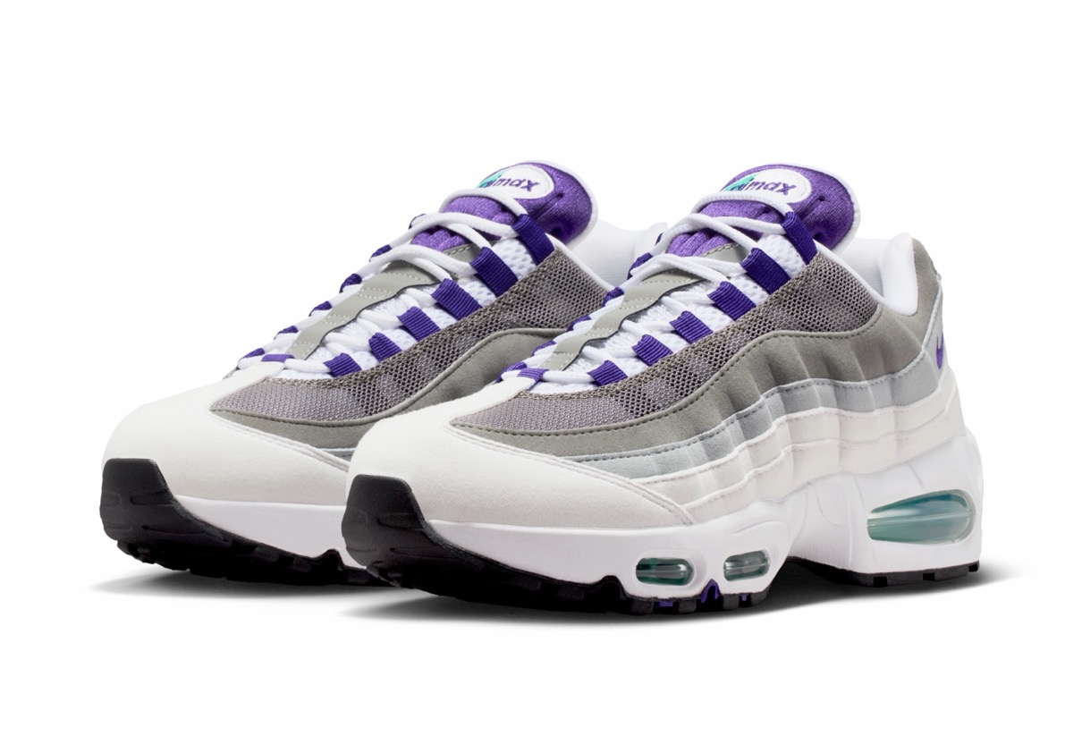 1995年に初めてリリースされ、シューズデザイナーのセルジオ・ロザーノが人体の背骨からインスピレーションを得てデザインしたナイキの人気スニーカー「エアマックス95(Air Max 95)」。同モデルの30周年を記念し、Nike Airユニットとウィンドウが大きい最初期型シルエット 通称“Big Bubble”(ビッグバブル)がAM1に続き復活。今回復刻されるカラーは、ウィメンズOGカラーのひとつ通称“Grape”。ホワイト/グレーを基調としたアッパーに落とし込まれたコートパープルとエメラルドクリーンのアクセントが特徴的だ。
