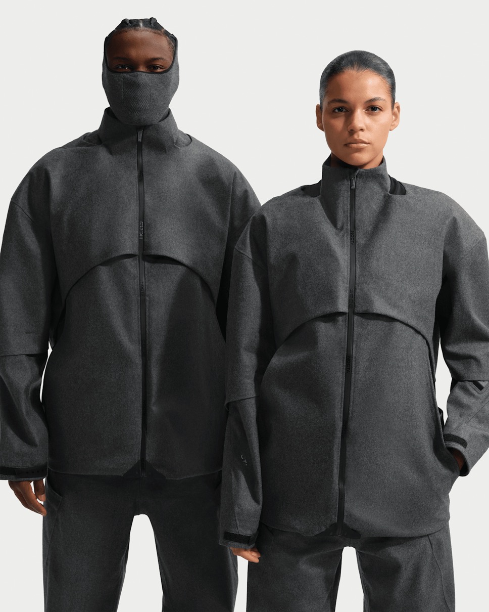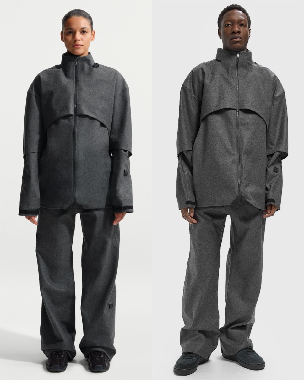 撥水加工を施した日本製ウール混紡フロージャケットは、取り外し可能なエンジニアードニットマスク付きネックウォーマーが付属。3Dレンチキュラーの袖トリムを備え、内部にはナンバリングラベルがあしらわれる。その他にもフローパンツ、ハイエナロングスリーブ、フォールドパンツ、ネックウォーマーがラインナップする。