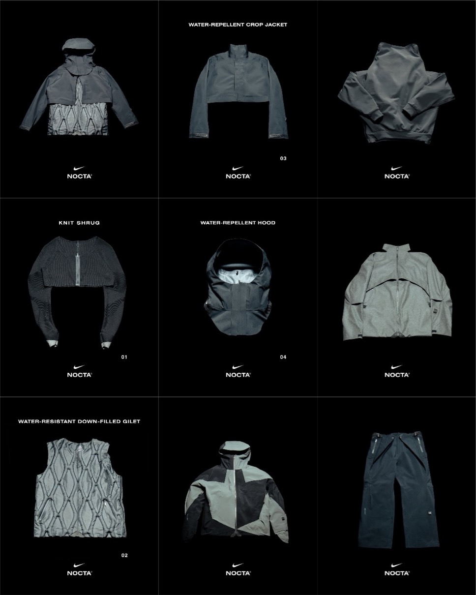 撥水加工を施した日本製ウール混紡フロージャケットは、取り外し可能なエンジニアードニットマスク付きネックウォーマーが付属。3Dレンチキュラーの袖トリムを備え、内部にはナンバリングラベルがあしらわれる。その他にもCMPジャケット、フローパンツ、ハイエナロングスリーブ、フォールドパンツ、ネックウォーマーなどがラインナップする。フォールドジャケットなど一部NOCTA.com限定アイテムあり。