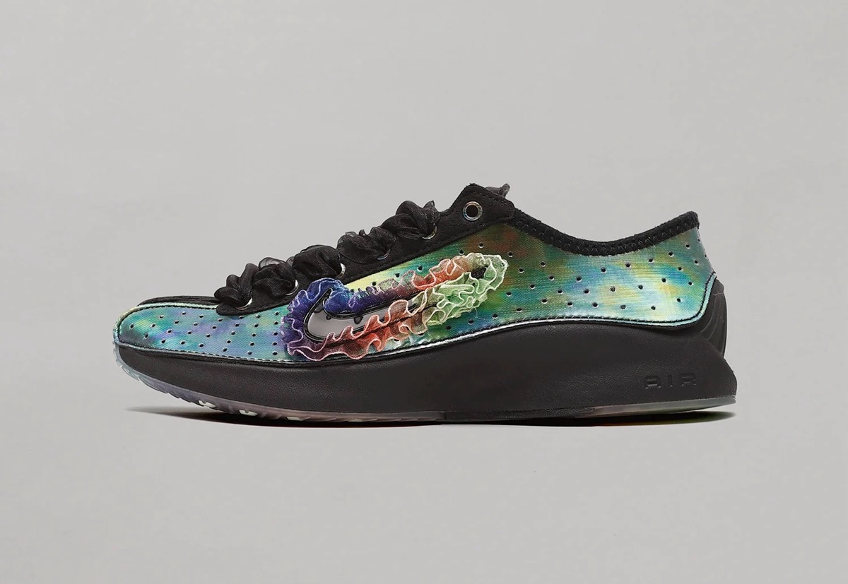 小泉氏が手掛けたのは、ロープロファイルのレーシングシューズとして誕生してから25年を経て、この春にライフスタイル向けに再展開されたこの細身のスポーツウェアモデルだが、彼ならではの大胆な彩りやフリル使いが存分に盛り込まれている。アッパーとシュータンのロゴにはレンズのように光の当たり方で色が変化して見える素材を用いる一方、アウトソールはマルチカラーのベースに2000年代の陸上スパイクのピンを思わせる緑のドットの配置が特徴的。