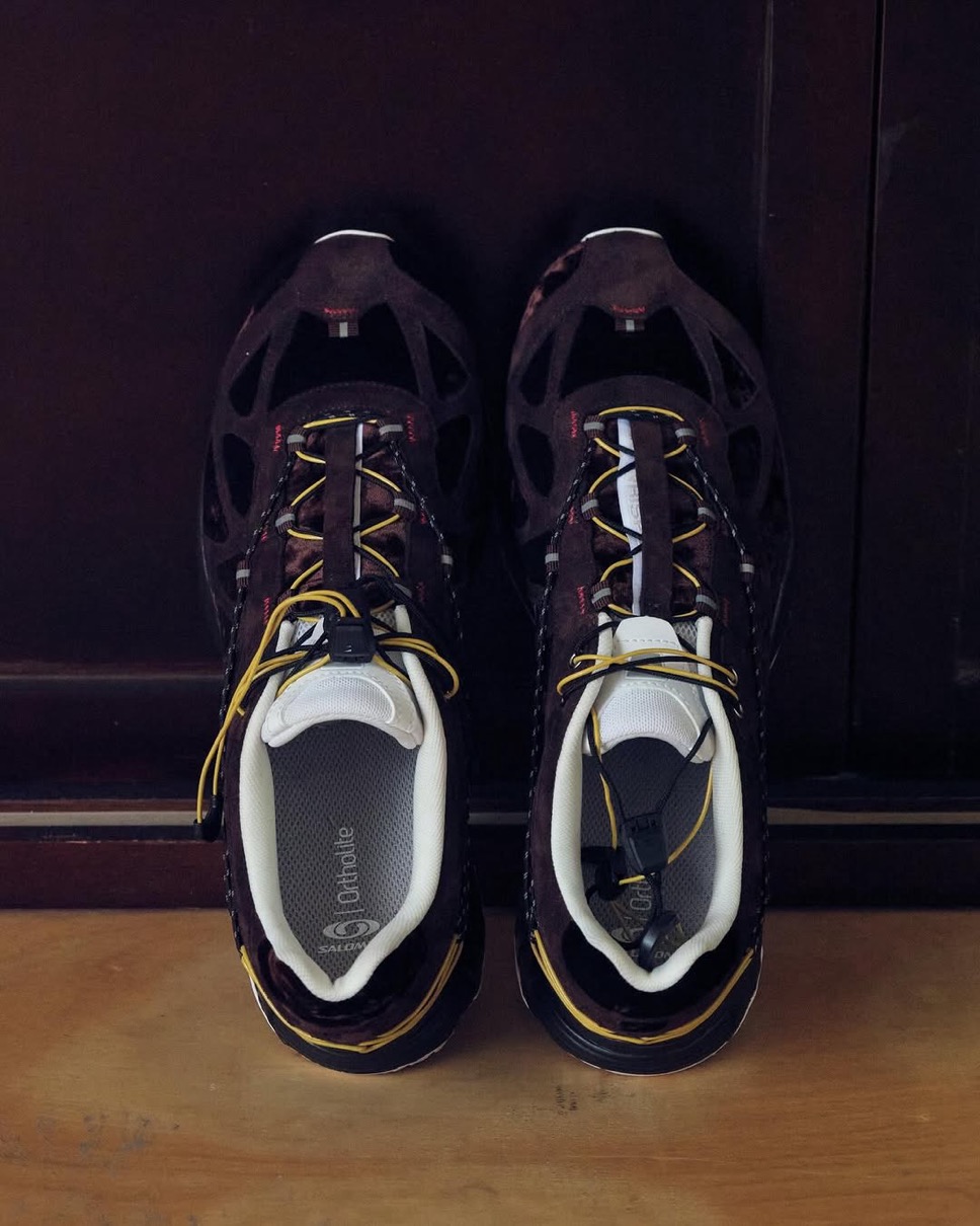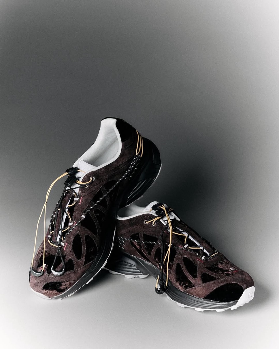 今作ではXT-Whisperの流れるようなラインと卓越した性能を基盤に、NULLUSが優雅さと遊び心ある構造的ディテールを融合させ、シルエットを再構築した。アッパーには従来のメッシュとパネルの代わりに、高級カーフスエードとベルベット生地を採用。美しく遊び心あるタッチで、靴の触覚的魅力を高めている。NULLUSのシグネチャーである絡み合うデザイン言語をさらに反映し、レーシングシステムはデコンストラクトされた再設計を施している。黄色のレザーコードが黒と白の反射性レースと交差することで、シューズのダイナミックな流動性を増幅。タン部分では、黒と黄色のレーシングをずらして配置し、控えめでありながら意図的なレイヤリングを創出している。
