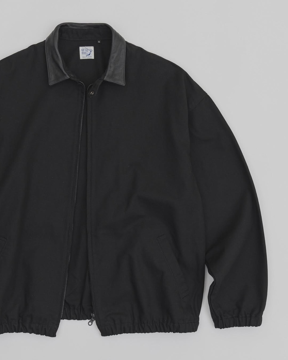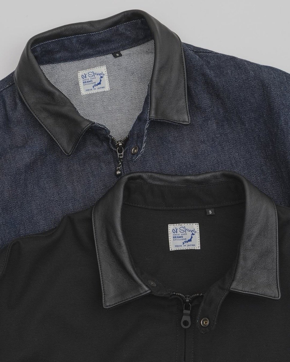 今季は〈orSlow〉に〈BEAMS〉が別注した『ジップアップブルゾン』2型が登場。高品質な日本製デニムを使用したモデルは、国内で紡績された糸をピュアインディゴのみで丁寧に染め上げることで、特有の深みある色合いと美しい経年変化を楽しめる仕上がりに。襟には上質な本革のウォッシャブルレザーを採用し、使い込むほどに味わいが増していく。また、ブラックのオックスフォード素材を採用したモデルは、しっかりとした打ち込みにより、着込むほどに体に馴染んでいくのが特徴です。同じくレザー襟とのコントラストが上品な印象を演出する。