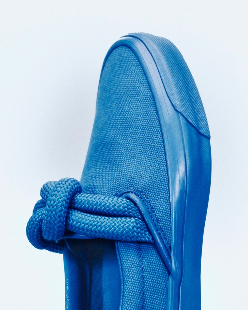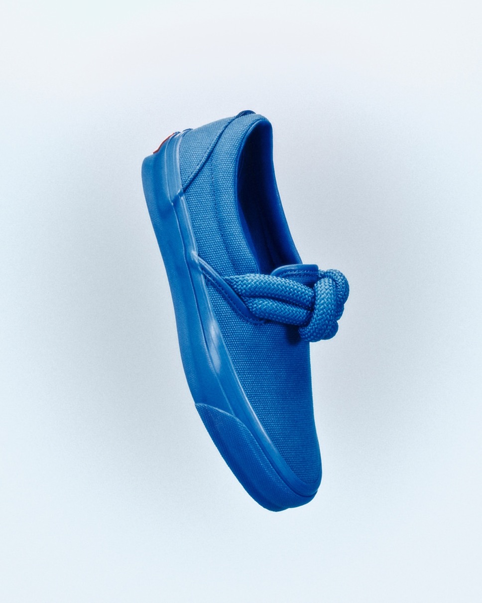 アイコニックなシルエットを元に、彫刻的なノットのディテールを加えたOTW CLASSIC SLIP-ON 98 KNOT。質感と立体感を演出しながらも、スリッポンならではの着脱のしやすさは変わらず。ブルーには厚手のキャンバス、ブラックにはヘアリースエードをアッパーに採用。クッション性に優れたインソールとグリップに特化したVIBRAMソールで新しいタッチを添えている。