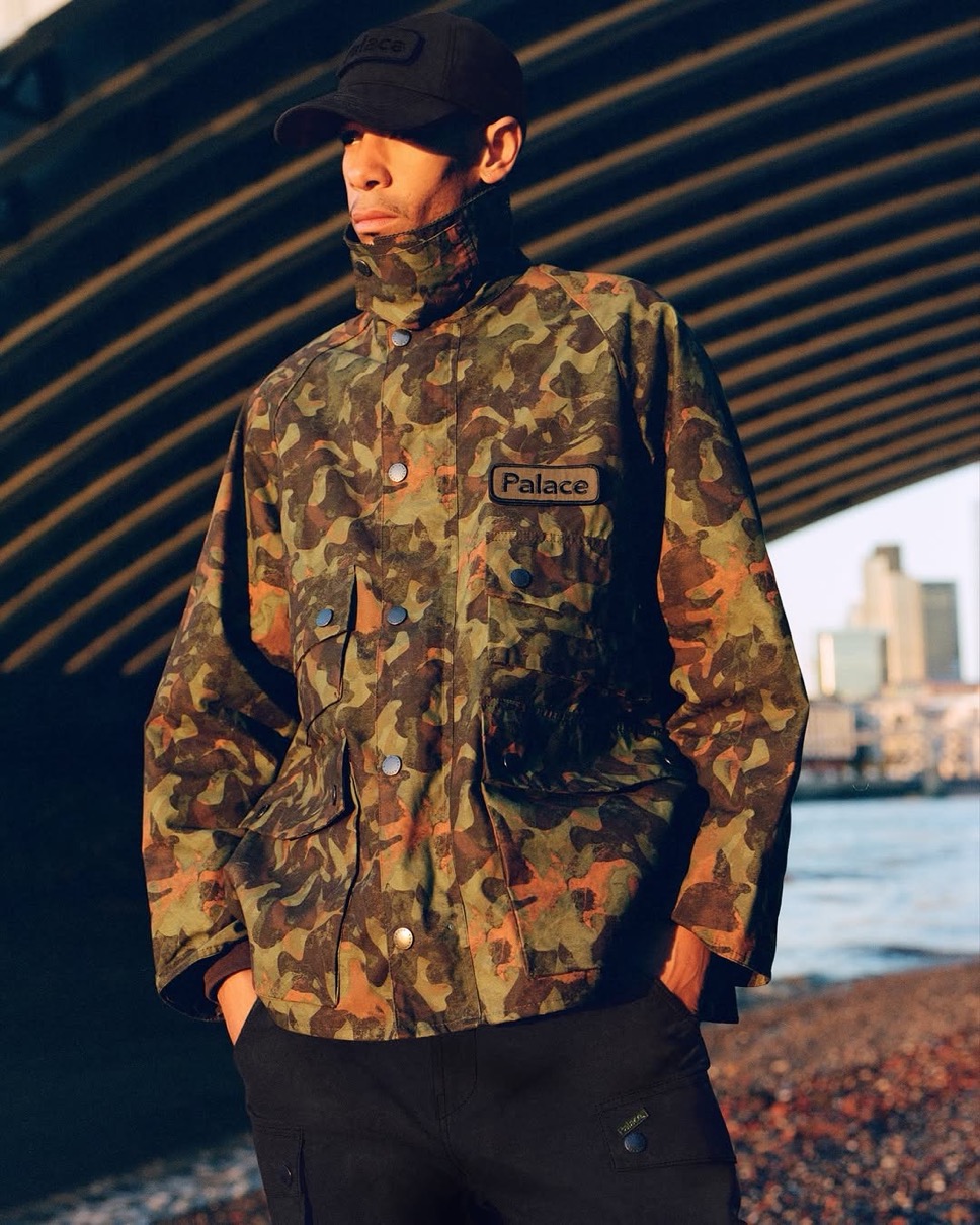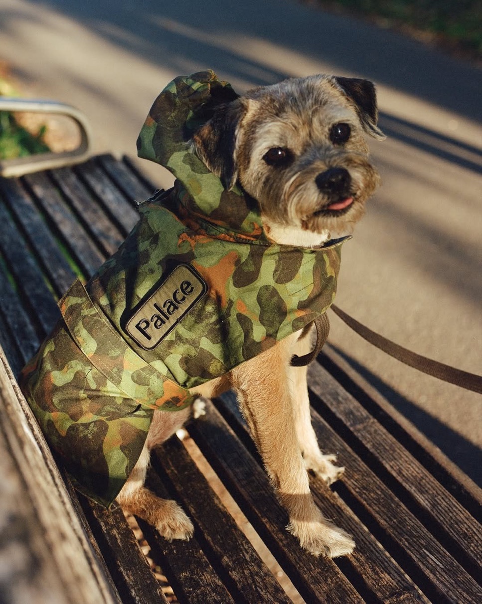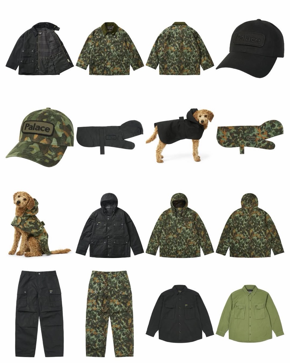 その他全身コーディネートを可能にするパンツなども展開。パレス バーバー キャップは6パネル構造のドライワックス素材で、取り外し可能なフックアンドループ式フロントバッジ付き。ユニークなアイテムとして、ペット用のパレス バーバー ドッグコートも登場。カモフラージュプリントのドライワックスシェル、フード、外部ポケット、調節可能なウエストストラップを備えている。