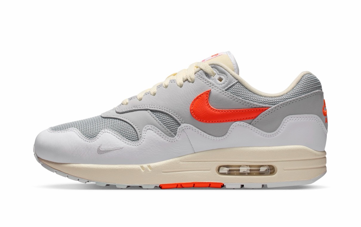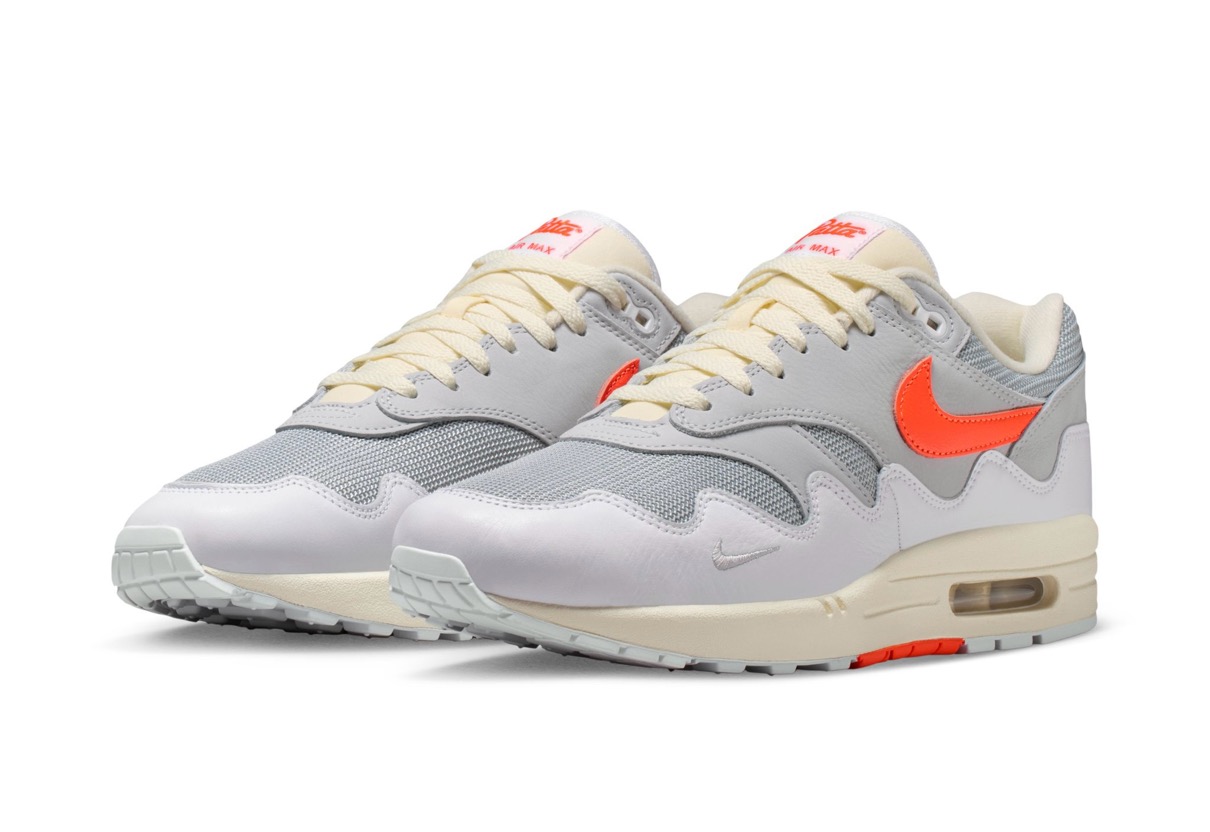 ティンカー・ハットフィールドがデザインを手がけ1987年に誕生した不朽の名作「Air Max 1(エアマックス1)」。今作ではPattaがデザインした波形マッドガードを採用しており、ホワイトやブラック、グレーに鮮やかなハイパークリムゾンのカラーを落とし込んだ全2色が展開予定。Pattaではサテン ボンバー ジャケットとウェーブ Tシャツもリリースされる。