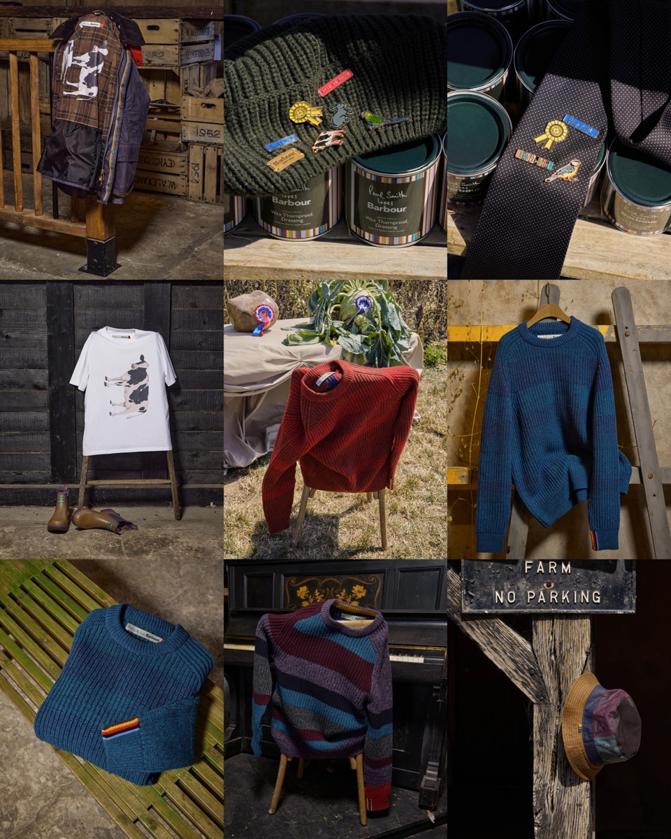 本コレクションには、ポール・スミスらしい独自の視点で再解釈したバブアーを象徴するコートをはじめ、ニットウェア、アクセサリー、Tシャツなど多彩なアイテムが揃う。プロダクトは英国の「カントリーショー」から着想を得ており、ユーモアを交えたアプローチでカントリースタイルを再構築。独特な色合いのワックスドコットンやパッチワークのディテール、さらに“フリージアン牛”のモチーフなど、遊び心のあるデザインが随所に取り入れられている。
