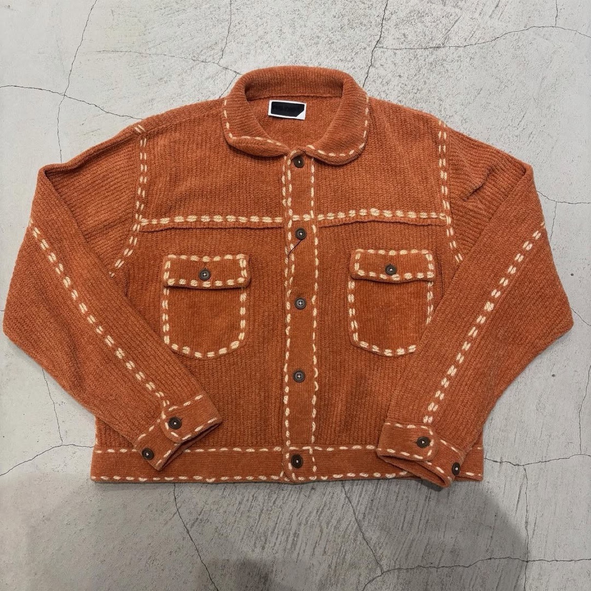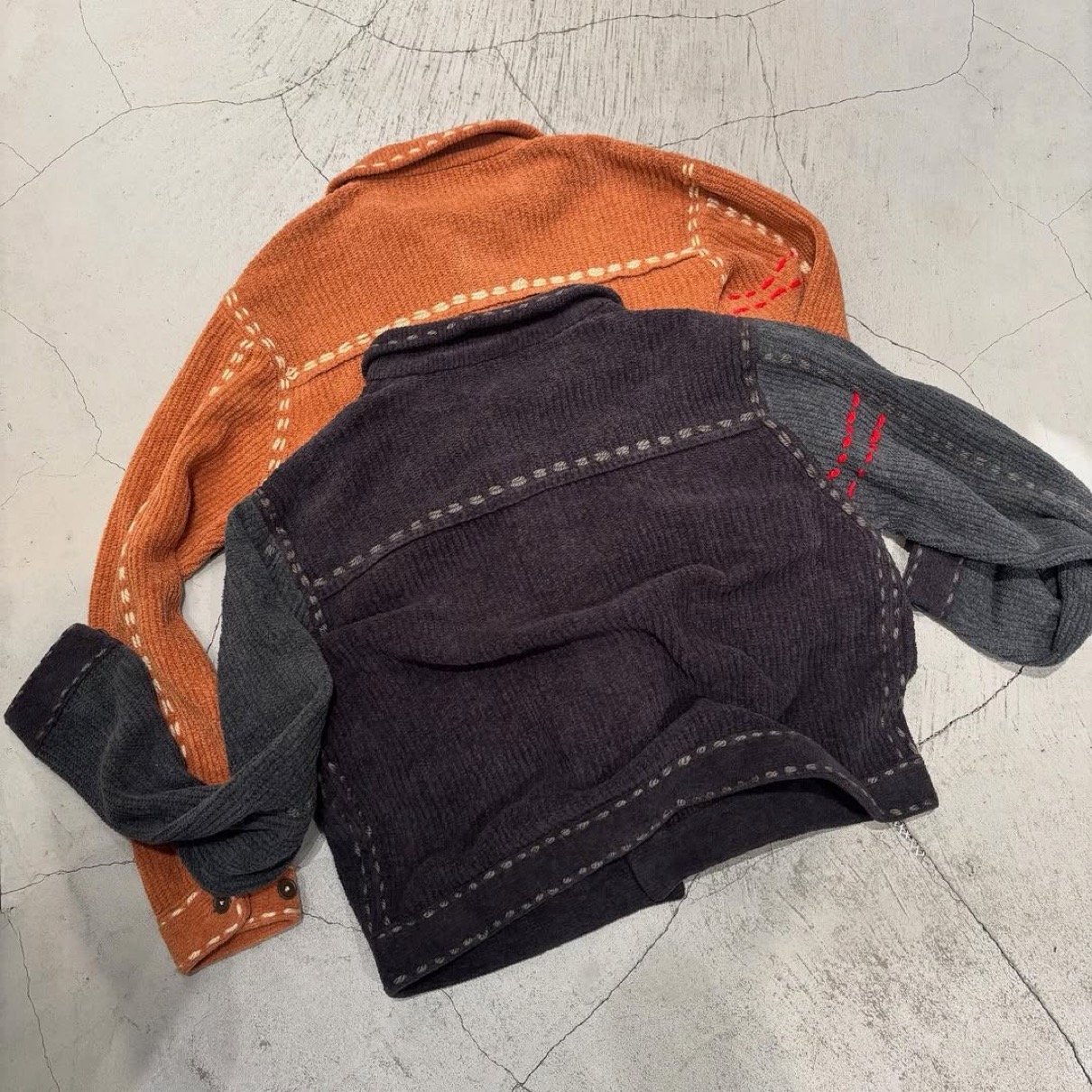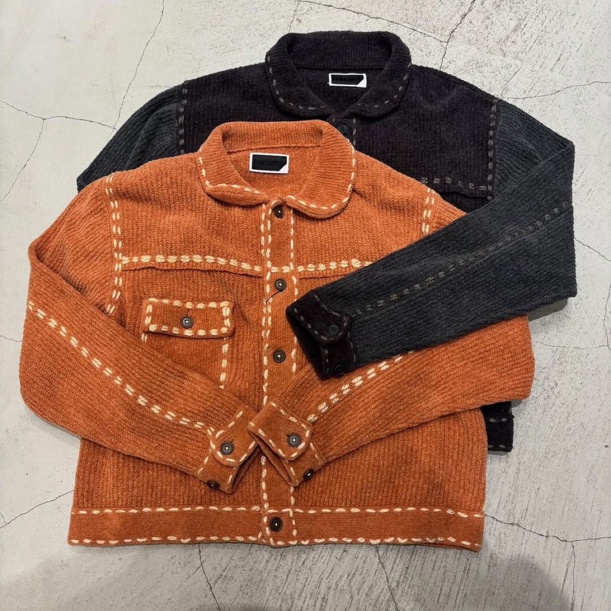 柔らかい質感に、都会的なムード。深みのあるカラーが際立つ、スペシャルな別注アイテムが登場。今作は、クラシックなデニムジャケットをベースに、再構築した遊び心あふれるニットカーディガン。太めの糸で表現されたステッチがデザインのアクセントとなり、ニットならではの柔らかさと軽やかさを引き立てる。綿×ポリエステル素材を使用し、ロングシーズン活躍する汎用性の高さも魅力。カラーは、落ち着きの中に洗練を感じるDK.GRAYと、テディベアをイメージしたMD.BROWNの2色を別注。羽織るだけで奥行きと立体感をプラスし、日常のスタイリングにさりげない個性を添える一着だ。