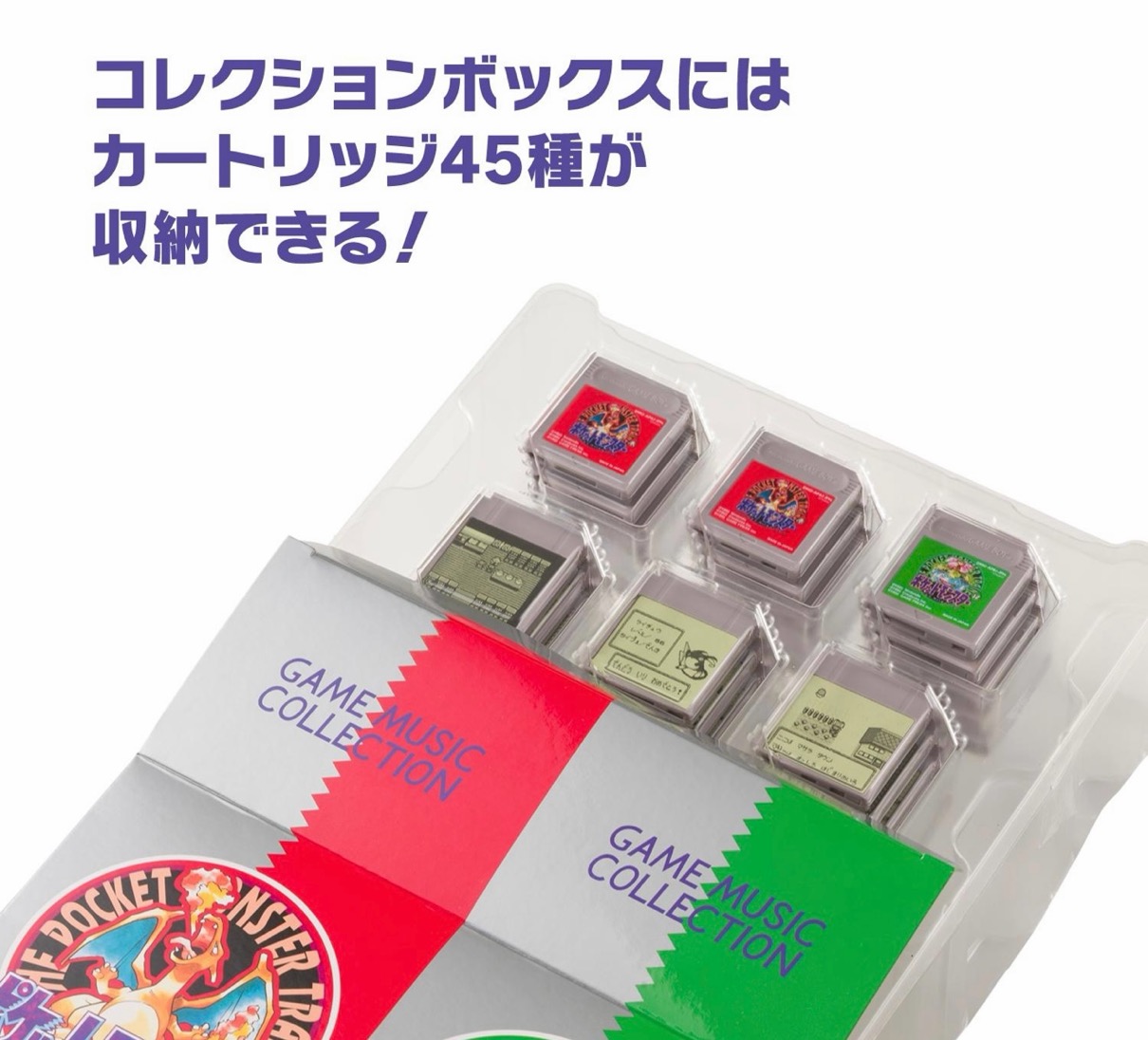ポケモンの最初のゲームソフト『ポケットモンスター 赤・緑』が発売されてから30周年を記念し、「ポケモン赤・緑 GAME MUSIC COLLECTION with GAME BOY型さいせいマシン」が登場。手のひらサイズに小型化されたGAME BOY型さいせいマシンに、カートリッジを差し込むと、ゲーム場面ごとのサウンドが聴くことが可能。カートリッジは合計45種類、付属のコレクションボックスに収納しよう。※使用電池はLR44 ボタン電池3個