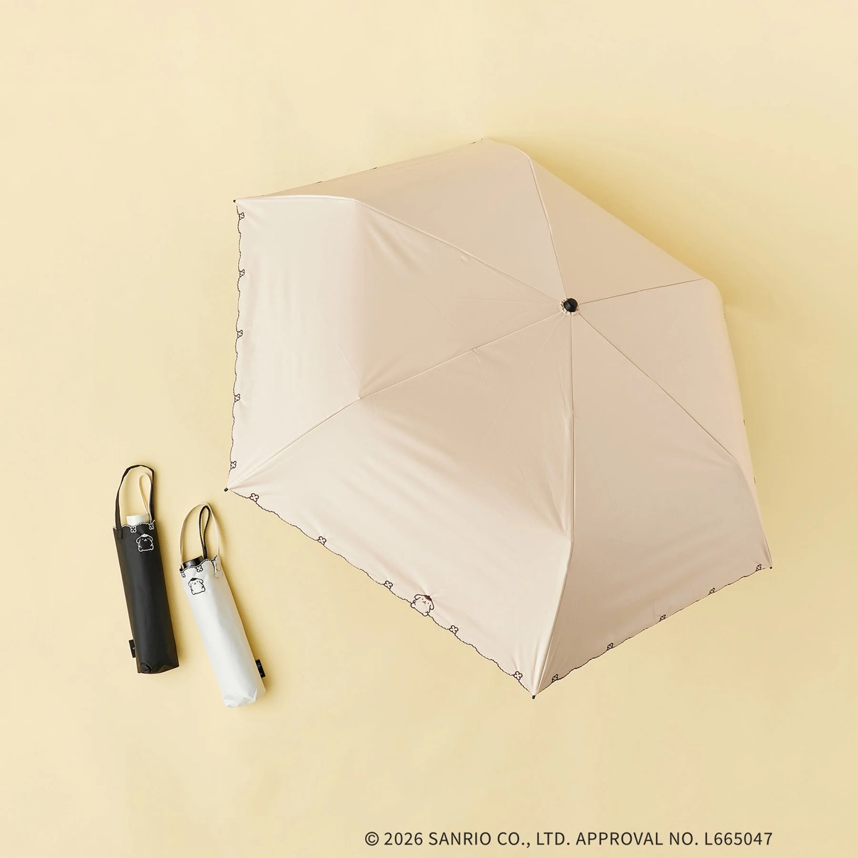 ポムポムプリンの刺繍デザインが可愛らしい、晴雨兼用の折りたたみ傘。