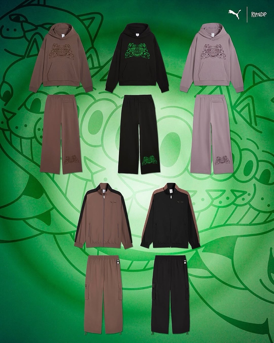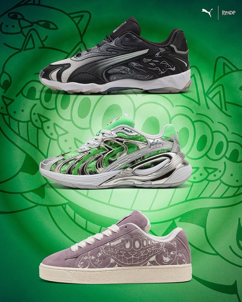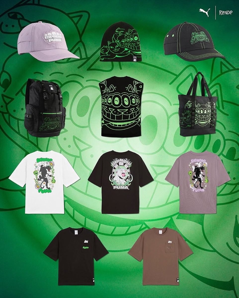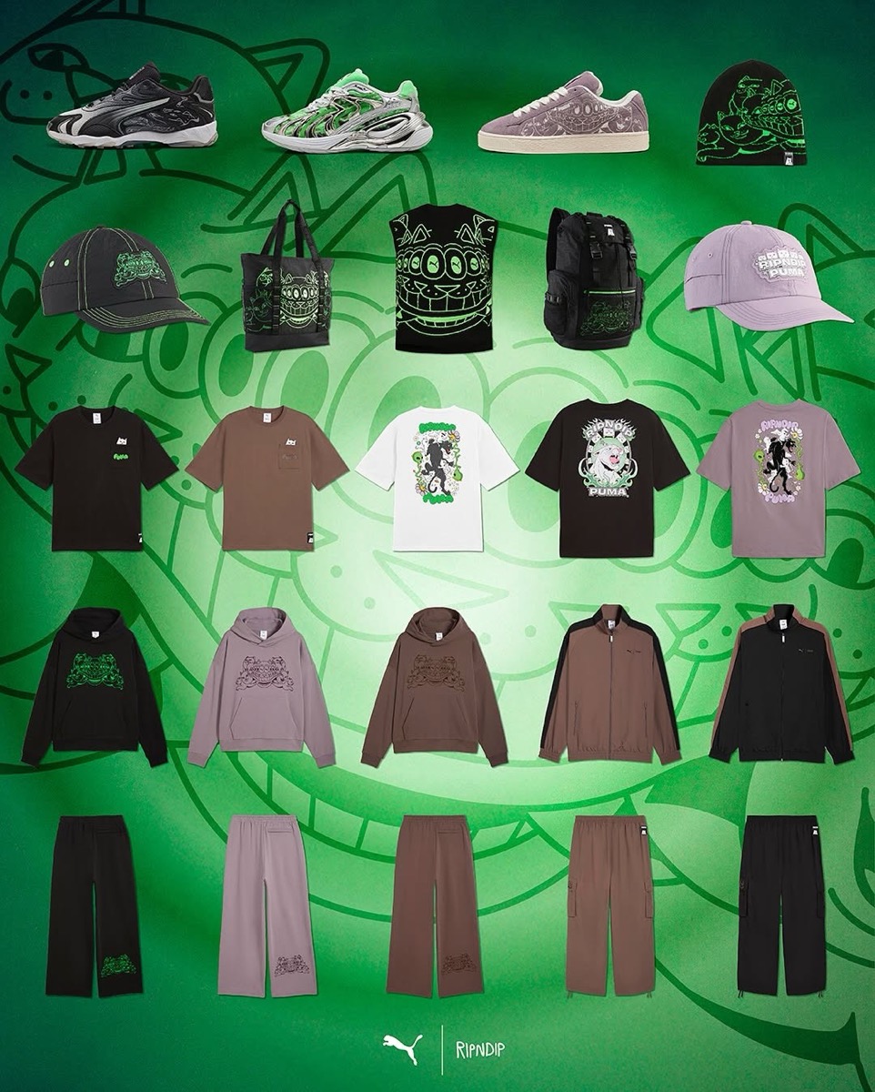 グローバルスポーツブランド「PUMA(プーマ)」と、ロサンゼルス発のストリートブランド「RIPNDIP(リップンディップ)」による新作コラボコレクションが、国内2025年9月27日(土)より発売予定。楽天市場 では一部アイテムのオンライン先行予約受付が開始している。