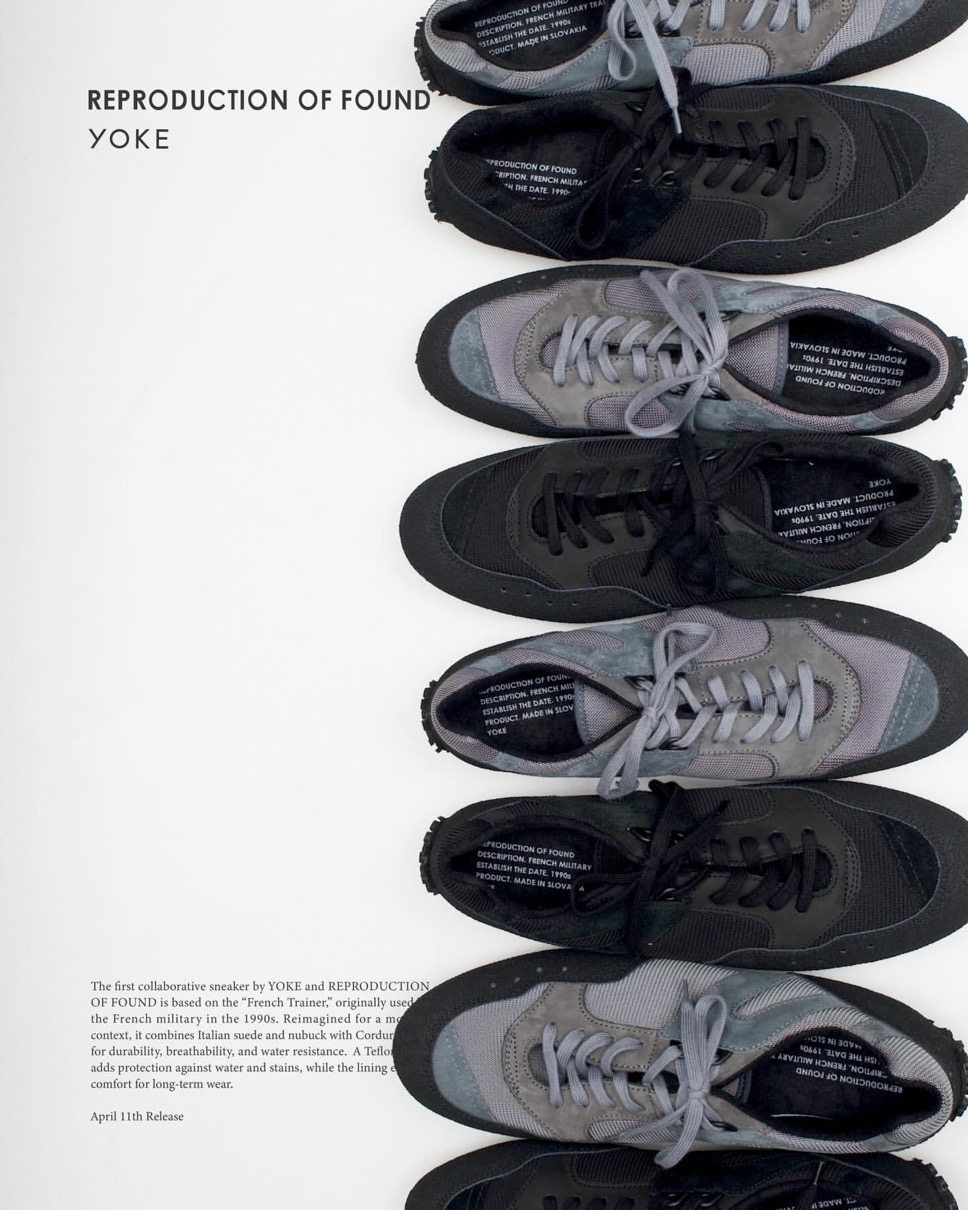 REPRODUCTION OF FOUNDとYOKEの初のコラボレーションスニーカーとなる本作は、1990年代にフランス軍でトレーニングシューズとして採用されていた通称“フレンチトレーナー”をベースに、現代的な視点で再構築したモデル。当時の軍用シューズを手掛けていたファクトリーに製作を依頼し、オリジナルの背景を受け継ぎながら、YOKEのフィルターを通して素材やディテールを再編集している。アッパーには、上質なイタリアンスエードやヌバックレザーを使用し、トゥやヒールには耐久性に優れたポリウレタン加工スエードを配置。さらに、通気性・耐久性・耐水性に優れたコーデュラメッシュナイロンを組み合わせている。また、生地表面にはデュポン社によるテフロン加工を施し、防汚性と撥水性を向上。ライニングにはファブリックスエードとメッシュを採用することで、長時間の着用においても快適な履き心地を実現。軽量なEVAを搭載したグリップ力の高いラバーソールにより、機能性と日常性を兼ね備えた一足に仕上げている。カラー展開は各パーツをトーンの異なるグレーで構成して、デザインをほんのり主張させた“GRAY” シックに1トーンで統一させた“BLACK”の2色展開。