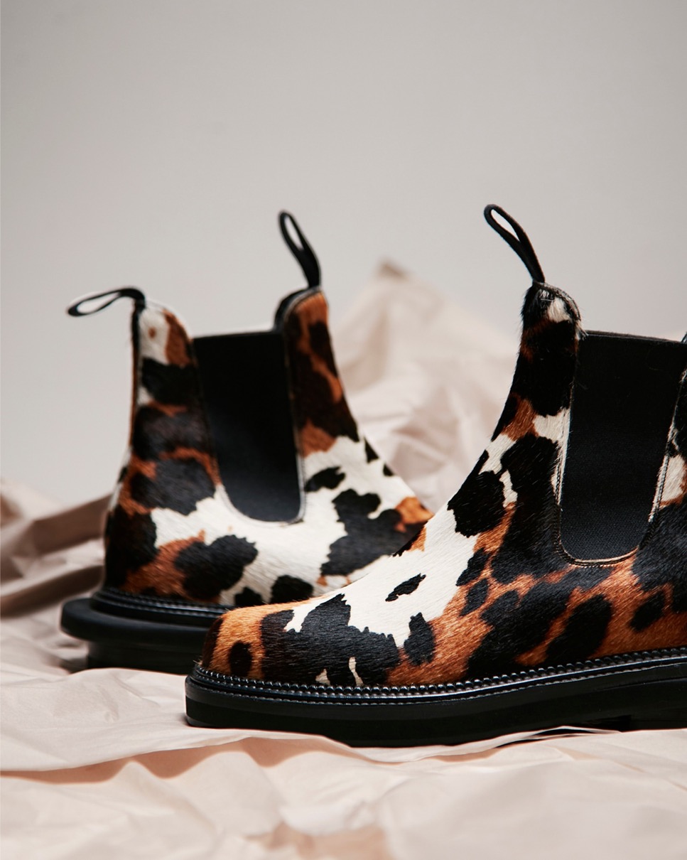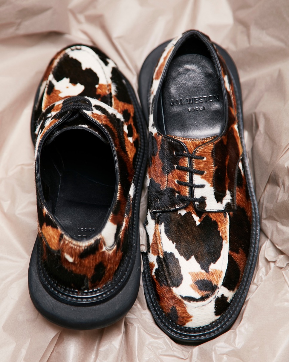 sacai Men’s Autumn & Winter 2025 Collection Women’s Autumn 2025 Collectionにて発表されたJ.M. WESTONとのコラボシューズ第三弾。2024FW、2025SSに続き3シーズン連続で、sacaiの阿部千登勢とJ.M.Westonのクラフツマンシップが融合する。今季はJ.M.Westonのシグニチャーローファー #180”(18万1500円)と“ゴルフ #641”(18万1500円)、“サイドコアブーツ”(21万4500円)といった3型のアイコンシューズを、sacaiのシグネチャーソールで大胆に再解釈。伝統的なシルエットにカウ柄プリントのカウハイドレザーを採用し、sacaiの製作した特別でドラマチックなオーバーサイズソールが更なるインパクトを与えている。