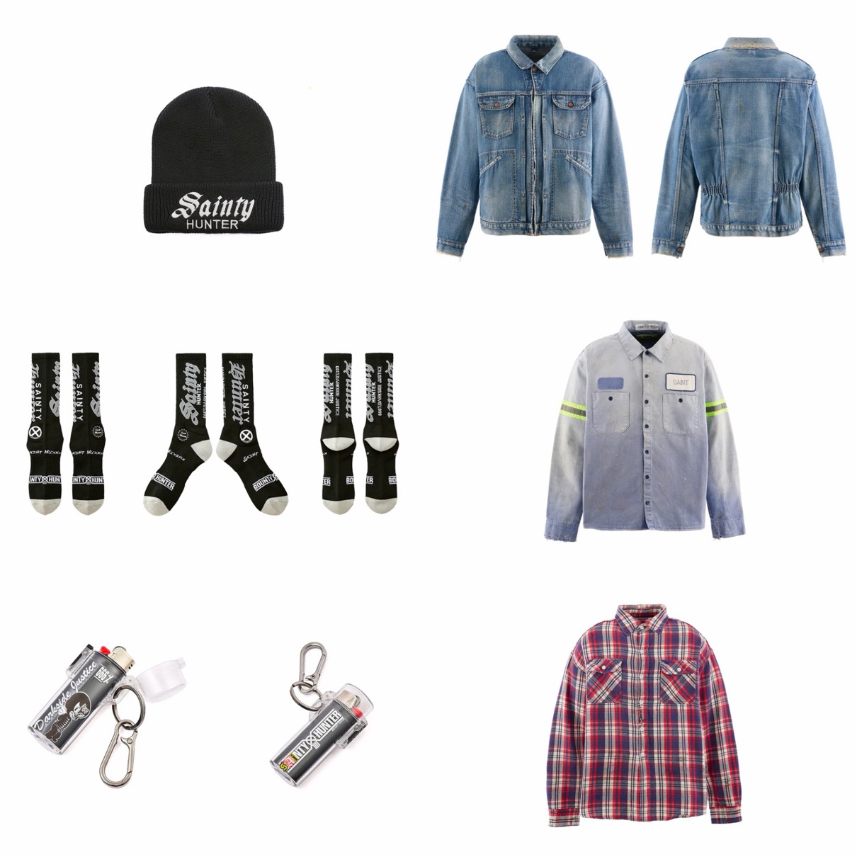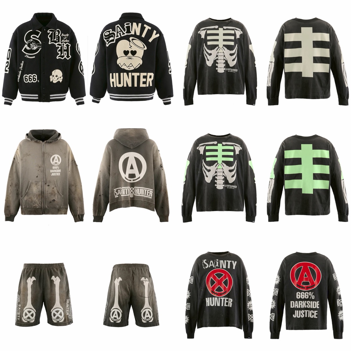 BOUNTY HUNTERを象徴するアイコン「SKULL KUN」を©SAINT Mxxxxxx仕様に再構築し、グロー・イン・ザ・ダークや「SAINTY HUNTER」のテキストなど、両者の世界観を融合したディテールを随所に採用している。スタジアムジャケットから、ジップフーディー、蓄光プリントのLS Tシャツ、アクセサリーまで豊富にラインナップ。