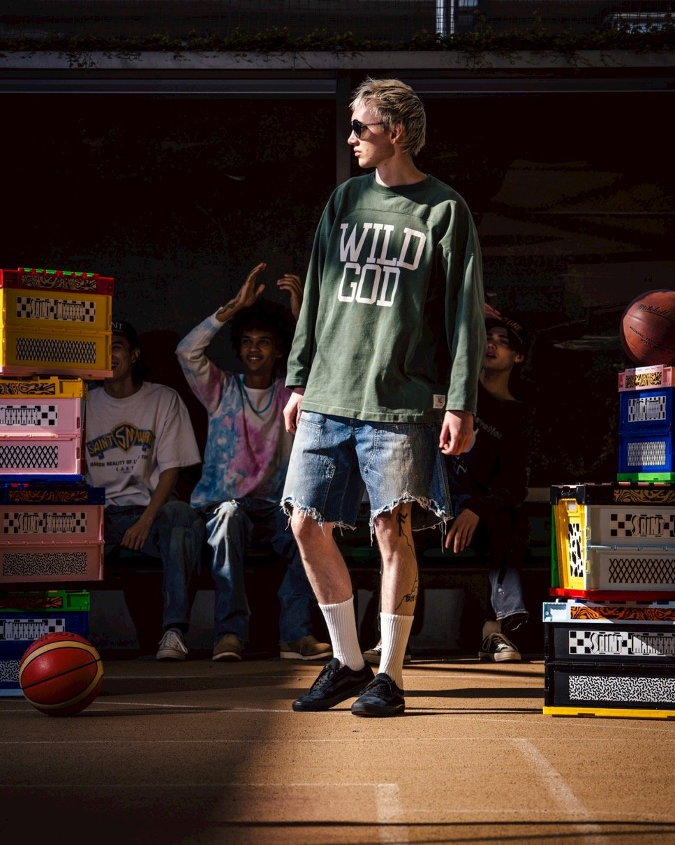 レギュラーアイテムにはフットボールシャツからインスパイアを受けったスウェットや、グラフィック、SAINTロゴを採用したロングスリーブTシャツ、フレアとストレートシルエットで初登場となるブラックデニムが展開する。