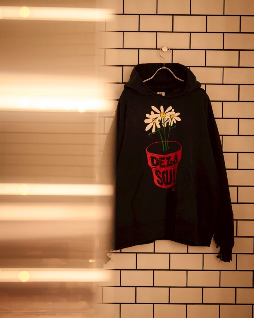 リアルなヴィンテージ感を追及し、 縫製から加工、仕上げに至るまでデザイナーの拘りが詰まったアイテムを展開している。©SAINT Mxxxxxx(セントマイケル)の2025FW Collection 8th. Dropでは、数々の名盤を世に送り出してきた伝説的ヒップホップグループ「DE LA SOUL(デラソウル)」との第二弾コラボレーションアイテムが登場。即完売のTシャツに続き、1991年リリースの名盤『De La Soul is Dead』のアートワークにインスパイアされた、アイコニックなグラフィックが特徴のフーディーをリリース。さらに2002年にスタートしたL.A.のブランドA LOVE MOVEMENTとのコラボレーションコレクションから、ALMのシグネチャーアイテムでもあるジャージをSAINT Mxxxxxxならではの感性でアップデート。ワッペンやブランドロゴが配されたテープによって、遊び心あふれる仕上がりに。