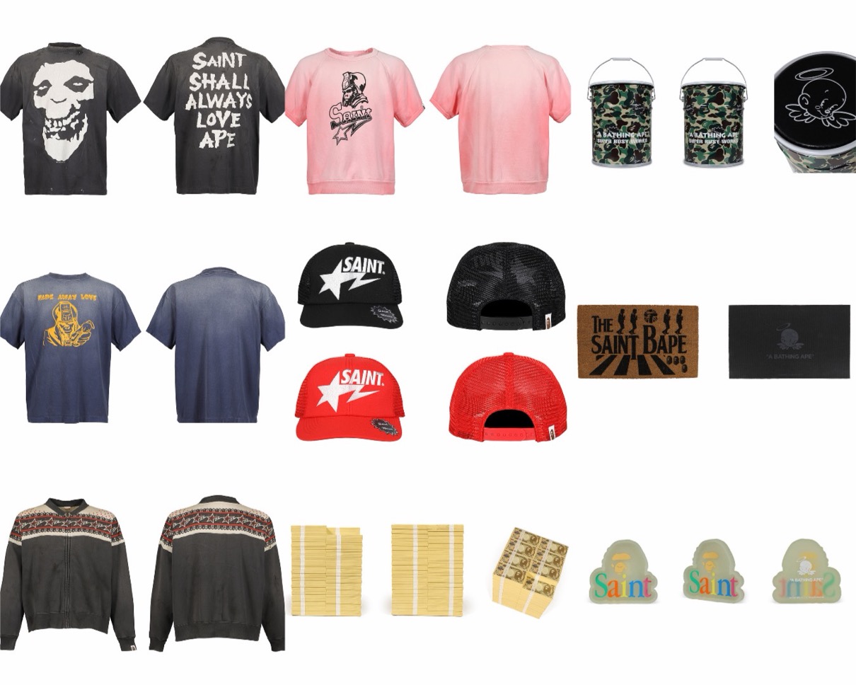 BAPE®コラボでは同ブランドのアイコンを起点に、©SAINT Mxxxxxxのフィルターを通して再構築することで、両ブランドの世界観が交差するアイコニックなコレクションが完成。ビジュアルモデルには両ブランドと親交の深いアーティスト・JP THE WAVY氏を起用。BAPE®原宿店にて、フォトグラファーのRK氏が撮りおろした。
