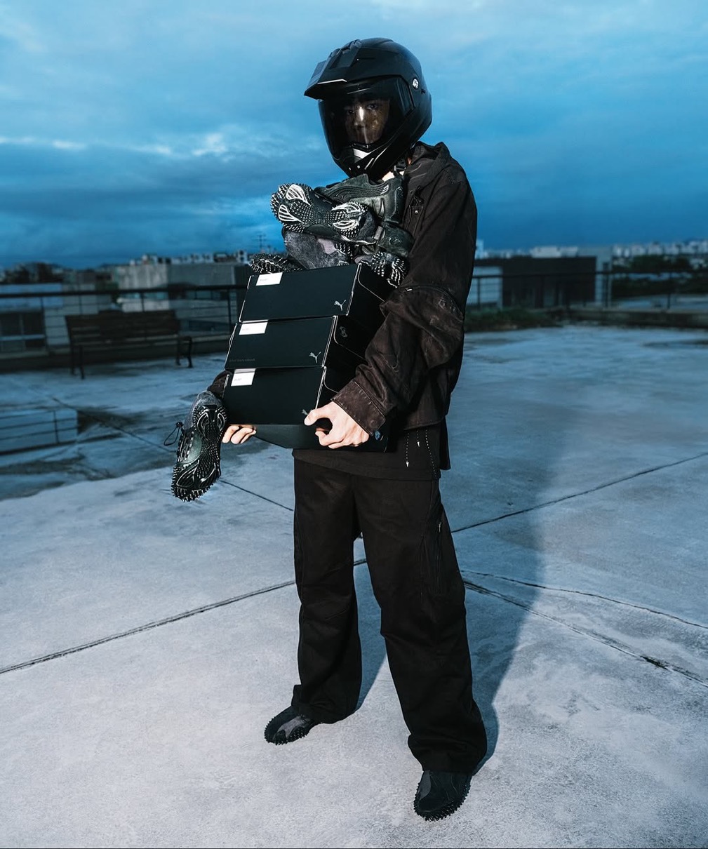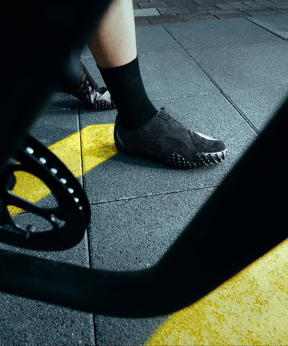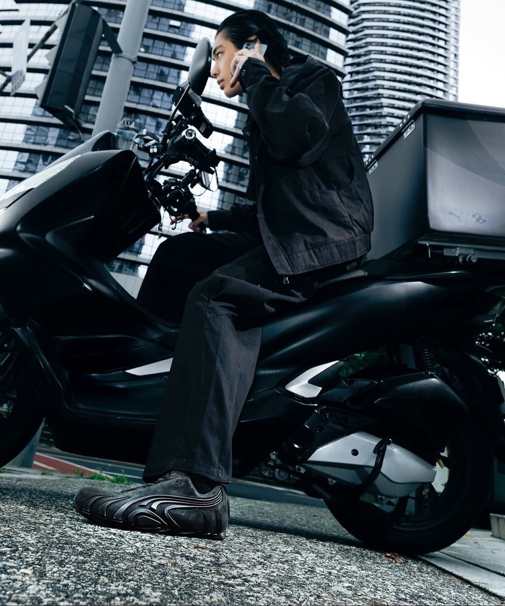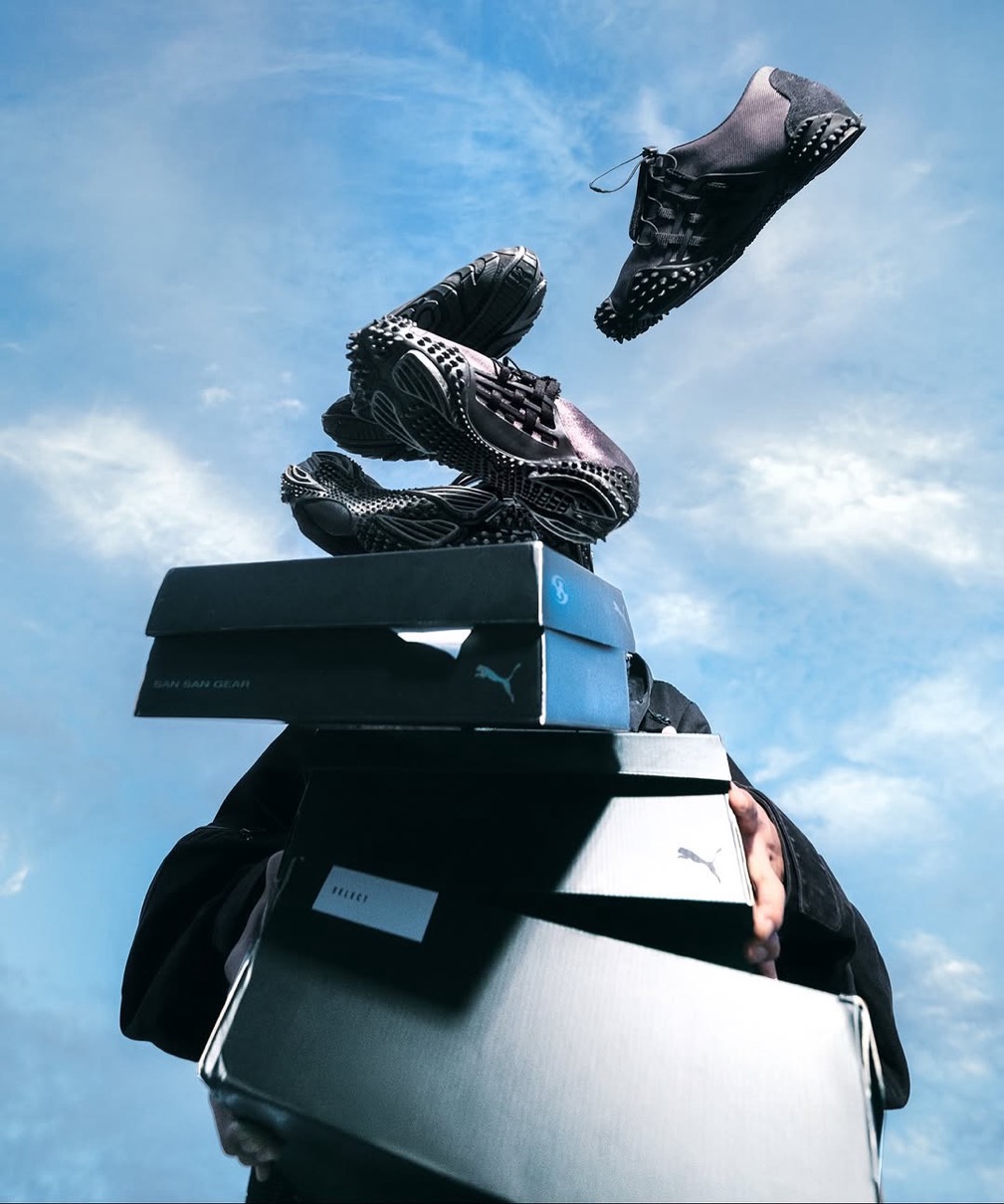 今回のコラボでは、1999年に初登場したプーマのシューズ「Mostro(モストロ)」と、2004年に誕生したアーカイブ『Talon(タロン)』をベースに採用。ブラックのアッパーにテック素材を取り入れ、Y2Kスタイルを新たな視点で再解釈。 SAN SAN GEARの“野性味”と“自由なスピリット”を、動きのあるスタイルに落とし込んだコレクションに仕上がっている。