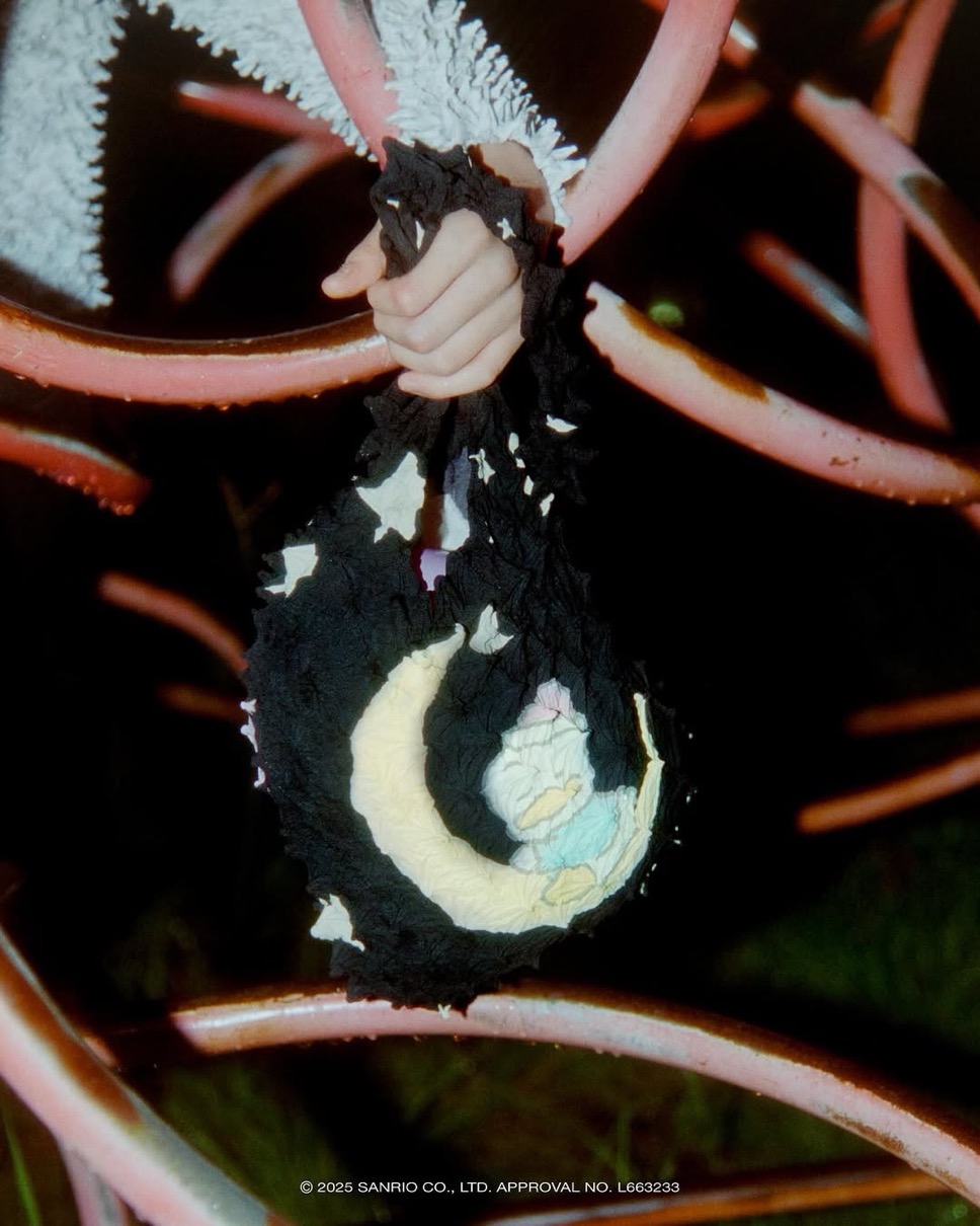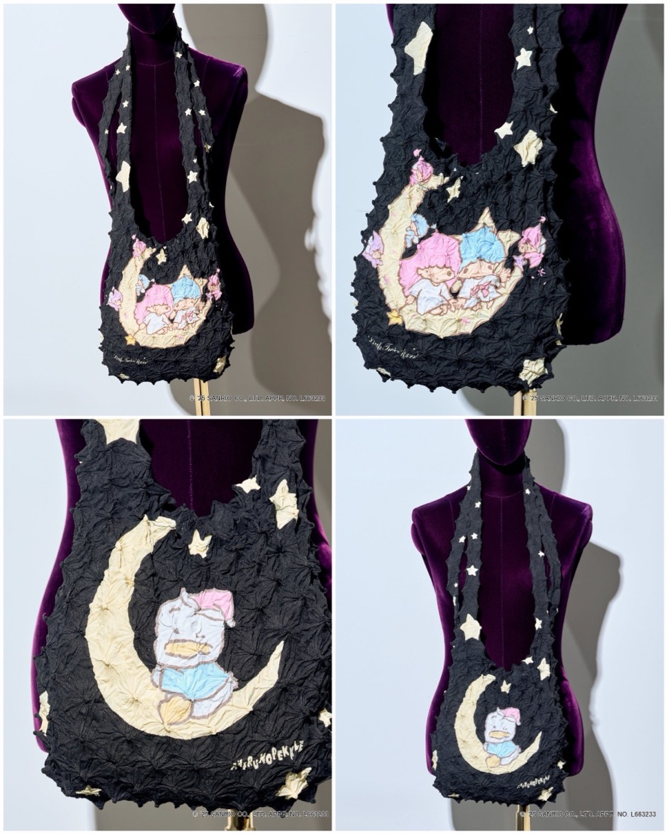 ブランドのシグネチャーデザインである絞り加工を施したバッグ。 インクジェットプリントが施されたポリエステルデシンを使用。夜空に浮かぶ星々、その中心には両面に「リトルツインスターズ」と「あひるのペックル」が月と共に浮かぶ。見た目以上に伸縮性が高いため、手荷物を収納するごとにロマンチックな夜空が広がってゆく。
