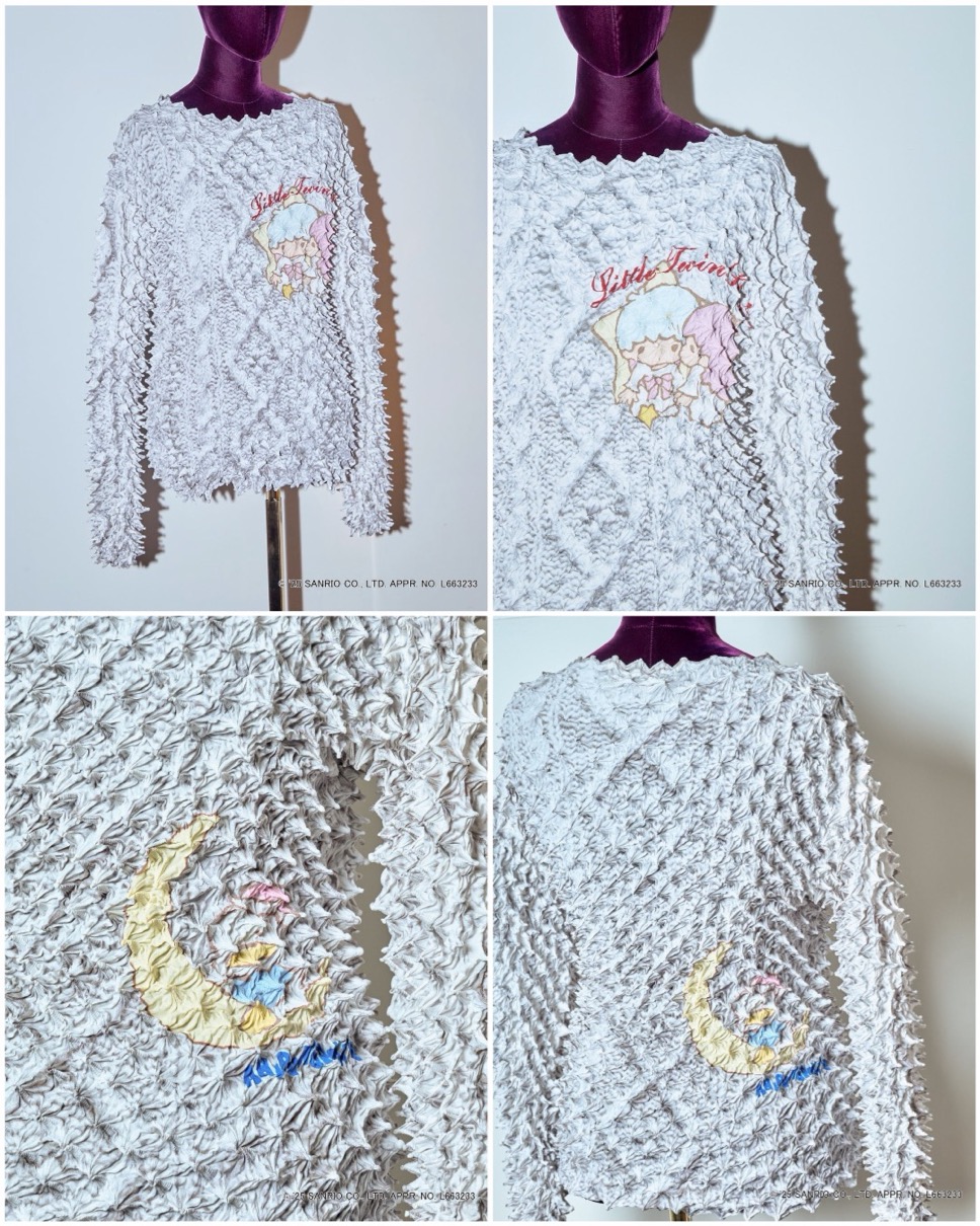 シグネチャーデザインのスパイキートップス。 インクジェットプリントが施されたポリエステルデシンを使用。プリントされたアラン模様の上にそっと舞い降りた「リトルツインスターズ」。そして袖口にはひっそりと「あひるのペックル」。暖かなニットに、夢見心地なプリント。それと相反するスパイキー加工が双方の個性を引き立たせる。まるで仲良く寄り添うキキ&ララのように。