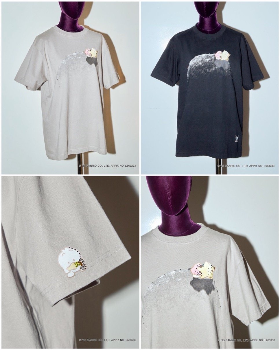 天竺生地のTシャツ。インクジェットプリントを用いて、月面の上に座る「リトルツインスターズ」がプリントされている。故郷に思いを馳せ、星を探しているようなノスタルジックな情景が描かれた。随所にあしらわれた煌めくラインストーンは星屑のように宇宙に散りばめられている。「リトルツインスターズ」を、袖の「あひるのペックル」と裾のエンジェルが優しく見守る。