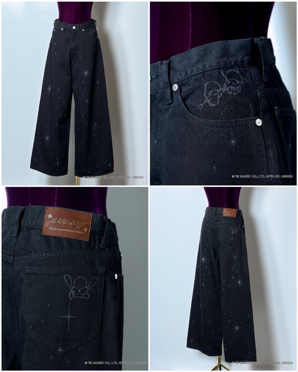 レーザーブリーチが描き出すのは、響きあう群星の運河。まるで溶け合うかのように共鳴する星々がブラックデニムの夜空に浮かぶ。その煌めく通り道の行く先、左ポケットには「リトルツインスターズ」が並び、後ろポケットには「あひるのペックル」が、夜空の静けさの中ひっそりと羽ばたこうとしている。その羽音が、夜空に優しい余白を描いて。