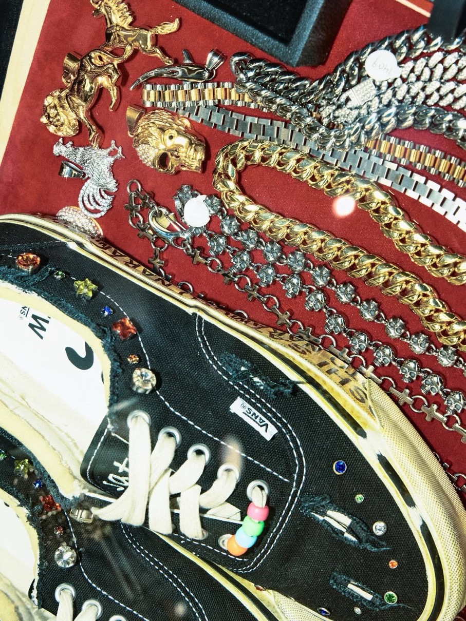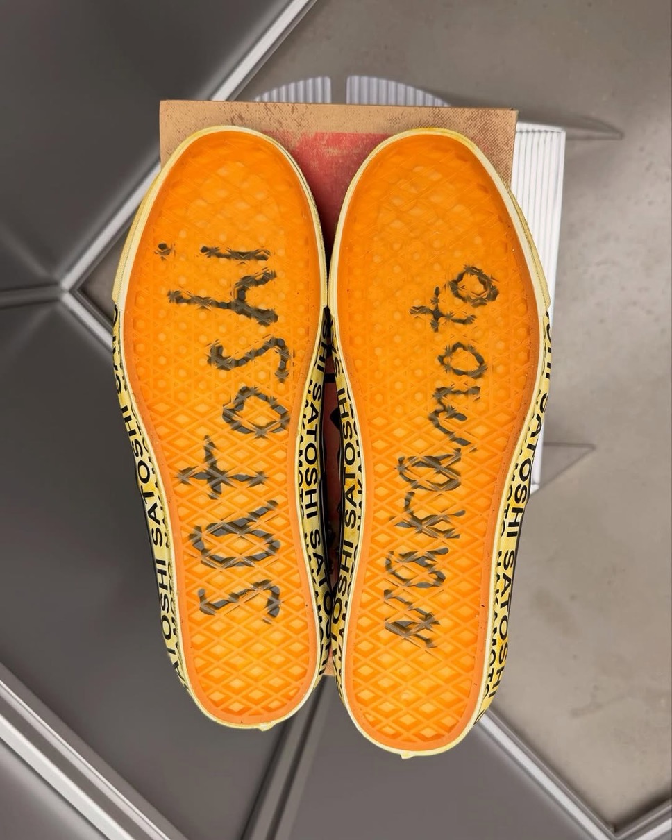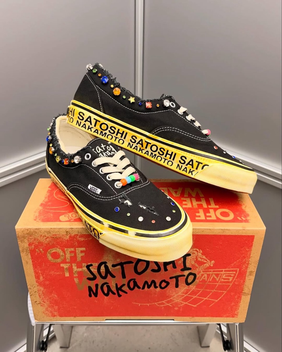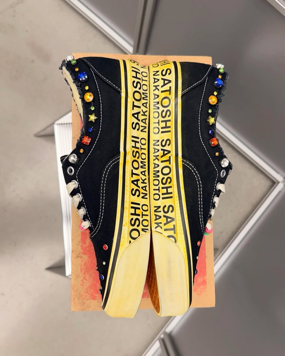 今回リリースされるコラボレーションモデルでは、Vansのアイコンシューズ『Era(エラ)』をベースに採用。ラフでエッジの効いたデザインは健在で、ミッドソールには「SATOSHI NAKAMOTO」の文字が繰り返し刻まれ、幾度も履き込まれたようなエイジド加工仕上げが施されている。アッパーはさらに大胆な物語を紡ぐ。ブラックのキャンバスは破れ、糸がほつれ、宝石やランダムなジュエリーパーツが計画的というより本能的に散りばめられている。輝く石もあれば控えめなものもあり、全体が“ラッキーチャームをぶちまけた”ようなエネルギーを放っている。靴紐さえも小さなプラスチックビーズをまとっており、革新的なデザインを通して常識に挑戦するという両者の共通のビジョンを反映している。