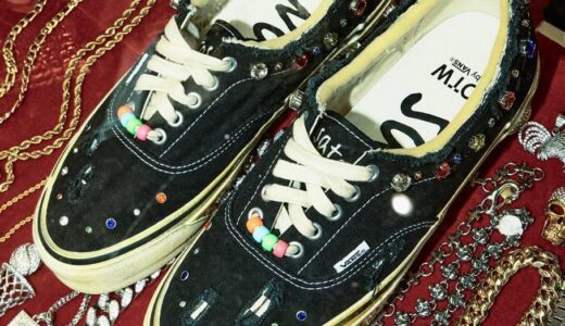 今回リリースされるコラボレーションモデルでは、Vansのアイコンシューズ『Era(エラ)』をベースに採用。ラフでエッジの効いたデザインは健在で、ミッドソールには「SATOSHI NAKAMOTO」の文字が繰り返し刻まれ、幾度も履き込まれたようなエイジド加工仕上げが施されている。アッパーはさらに大胆な物語を紡ぐ。ブラックのキャンバスは破れ、糸がほつれ、宝石やランダムなジュエリーパーツが計画的というより本能的に散りばめられている。輝く石もあれば控えめなものもあり、全体が“ラッキーチャームをぶちまけた”ようなエネルギーを放っている。靴紐さえも小さなプラスチックビーズをまとっており、革新的なデザインを通して常識に挑戦するという両者の共通のビジョンを反映している。