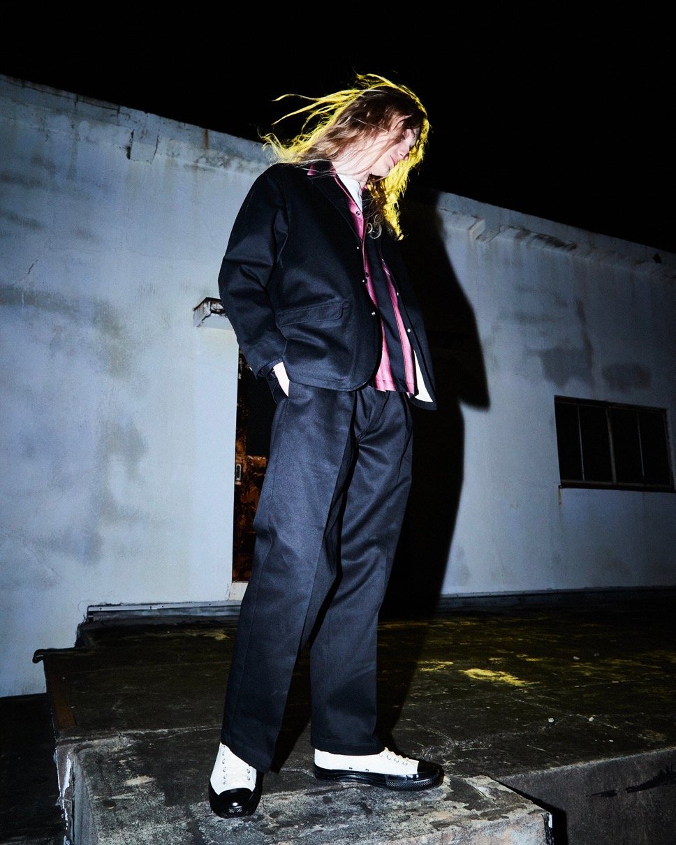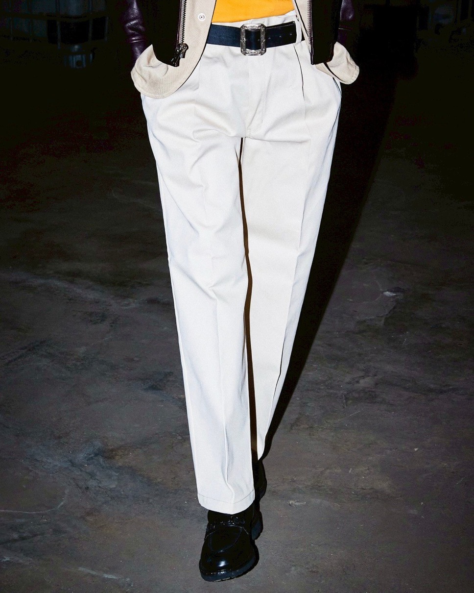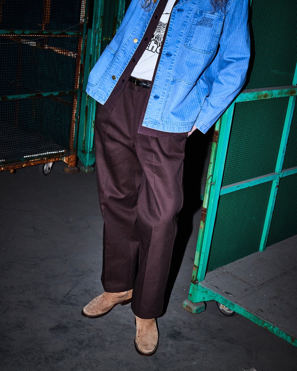 「Dickies(R)」の定番パンツをベースに、シルエットを見直したワークパンツ。ダブルライダースとのバランスを重視し、腰回りにはゆとりを持たせつつ、裾に向かって緩やかにテーパードをかけることで、ワイドでありながらストンと落ちる端正なワイドストレートを形成している。無骨さと品の良さを併せ持ち、スタイルを選ばず着用できる一本で、同シリーズのジャケットと組み合わせることで、セットアップとしての着用も可能。単体でも主役になり、合わせるアイテム次第で表情を変える、汎用性の高いプロダクトに仕上がっている。