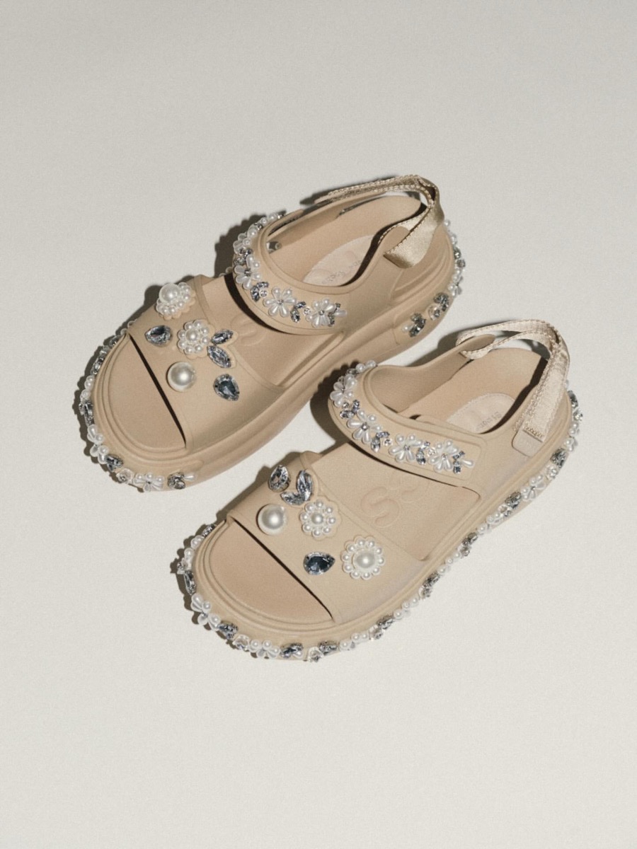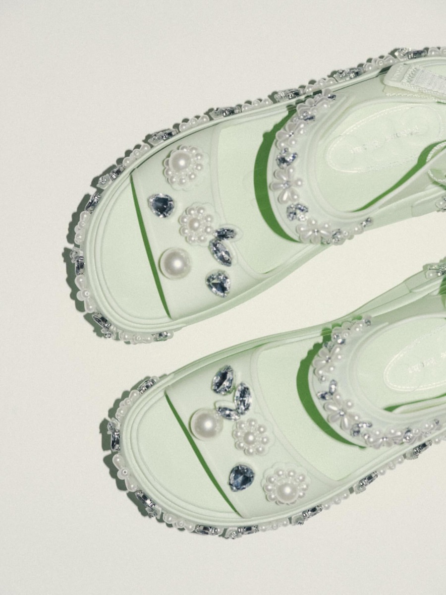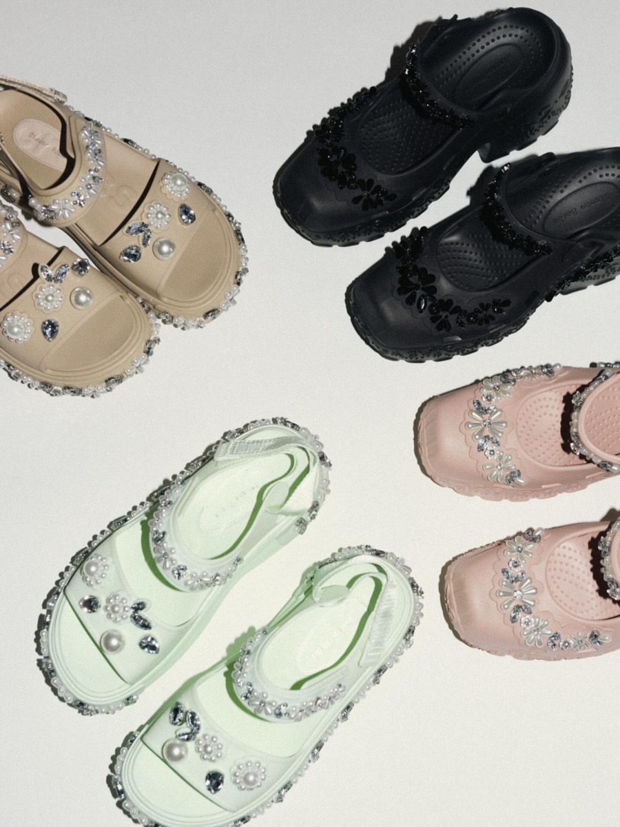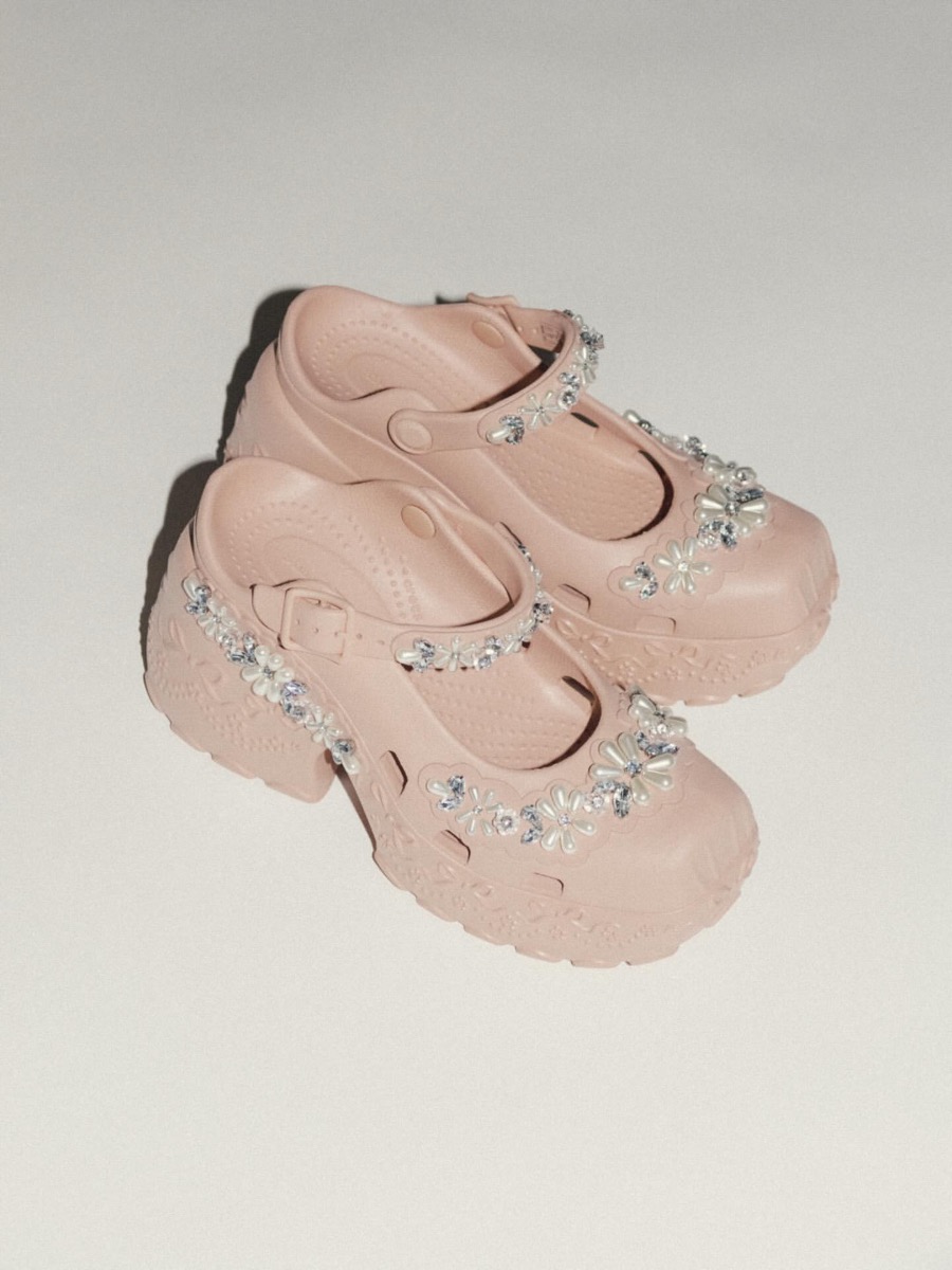 今回のコラボレーションでは、クロックスのアイコニックなレディースサンダルをデザイナー シモーン・ロシャの感性で再構築。シグネチャーデザインであるパールとジェムストーンの装飾、限定版ジビッツ™ チャームなどのディテールでロマンティックかつモダンな装いに仕上げている。