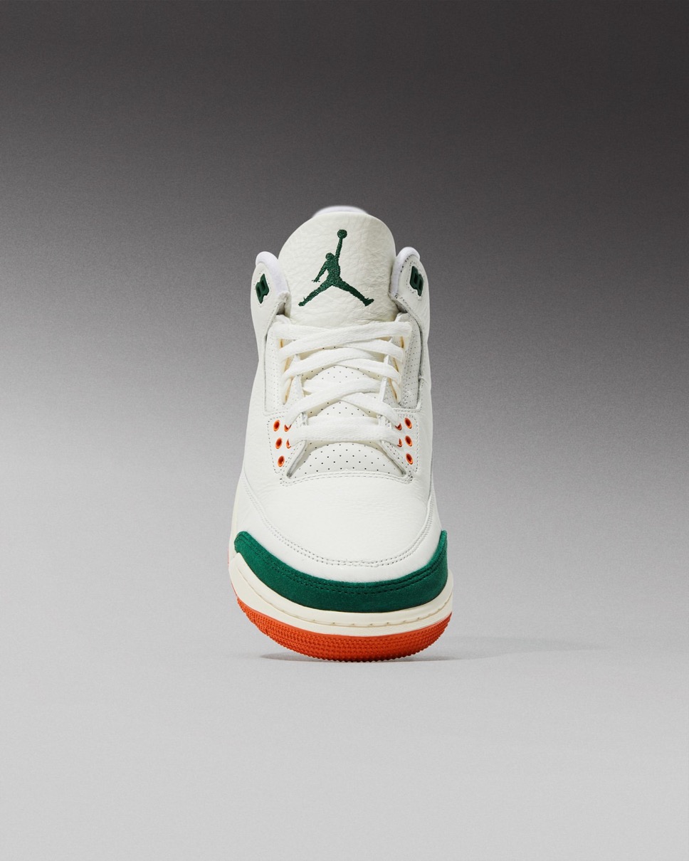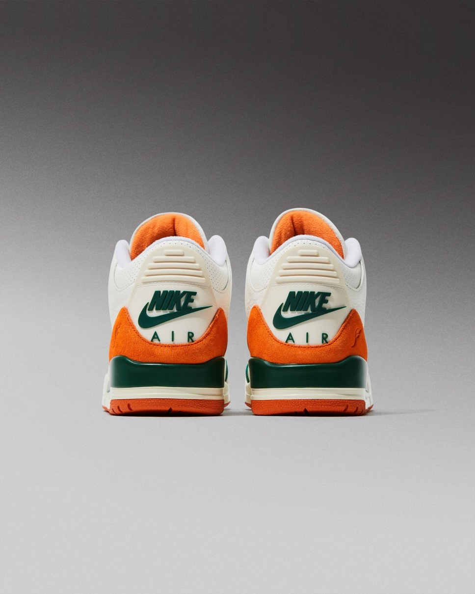 これまで様々なコラボレーションモデルを展開してきたSoleFly(ソールフライ)とJORDAN BRAND(ジョーダンブランド)。今作では伝説的シューズデザイナー Tinker Hatfield(ティンカー・ハットフィールド)がデザインを手がけ、1988年に初登場したモデル「Air Jordan 3(エアジョーダン3)」をベースに採用。アッパーはセイルのレザー素材にゴージグリーンのトゥ補強パーツとブライトマンダリンオレンジのヒールカウンターを組み合わせで構築。ヒールサイドにはSoleFlyのロゴを刻印し、バックにはオリジナルを象徴するNIKE AIRロゴがあしらわれている。