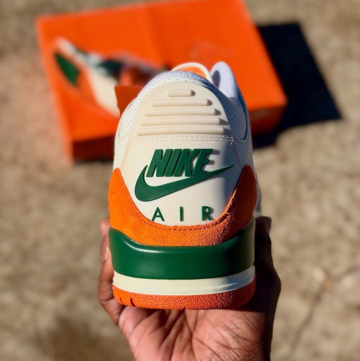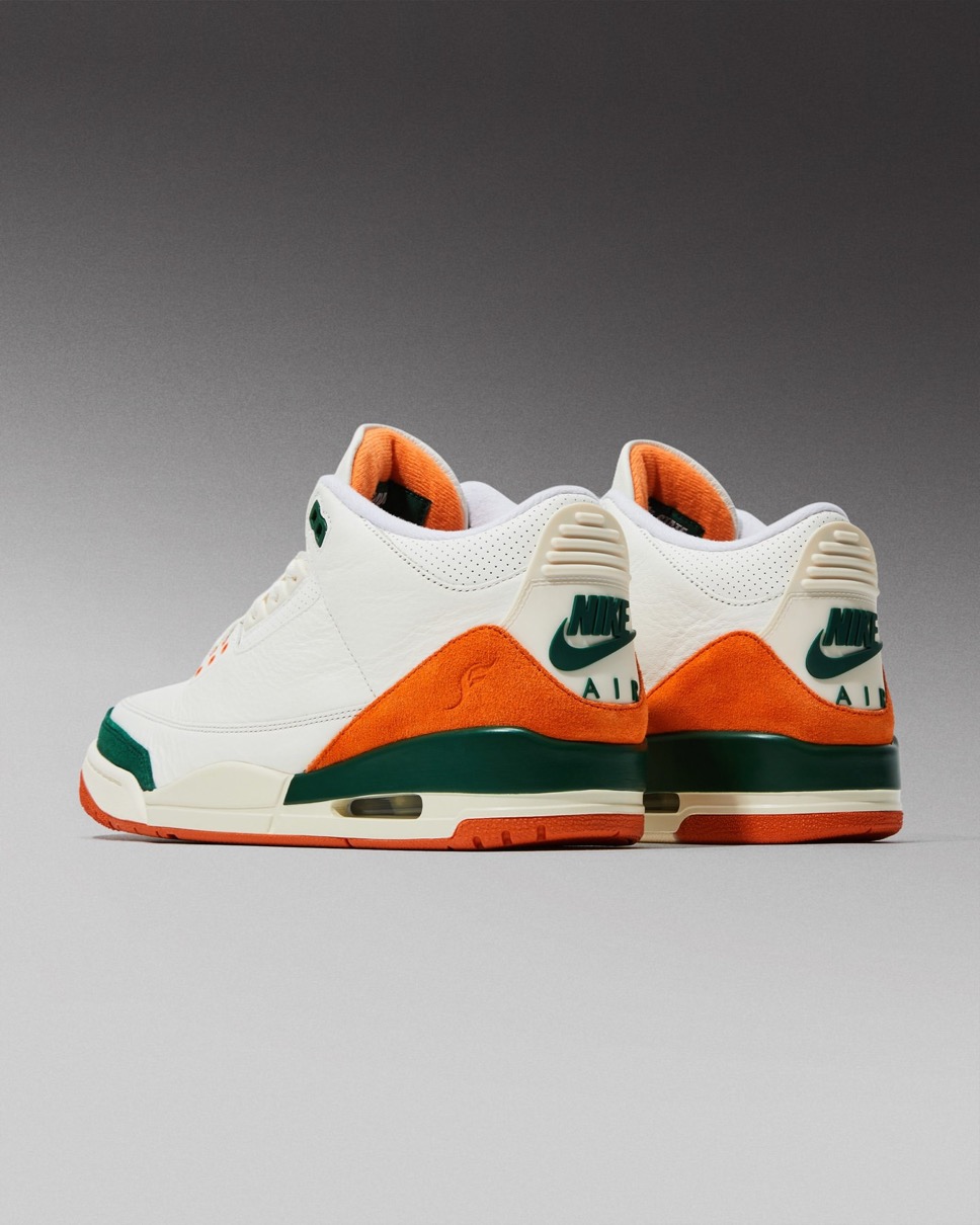 これまで様々なコラボレーションモデルを展開してきたSoleFly(ソールフライ)とJORDAN BRAND(ジョーダンブランド)。今作では伝説的シューズデザイナー Tinker Hatfield(ティンカー・ハットフィールド)がデザインを手がけ、1988年に初登場したモデル「Air Jordan 3(エアジョーダン3)」をベースに採用。アッパーはセイルのレザー素材にゴージグリーンのトゥ補強パーツとブライトマンダリンオレンジのヒールカウンターを組み合わせで構築。ヒールサイドにはSoleFlyのロゴを刻印し、バックにはオリジナルを象徴するNIKE AIRロゴがあしらわれている。