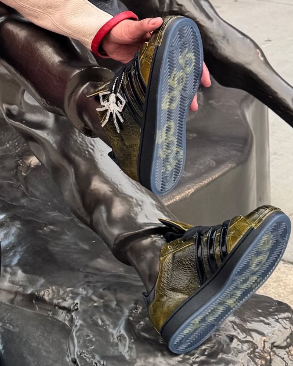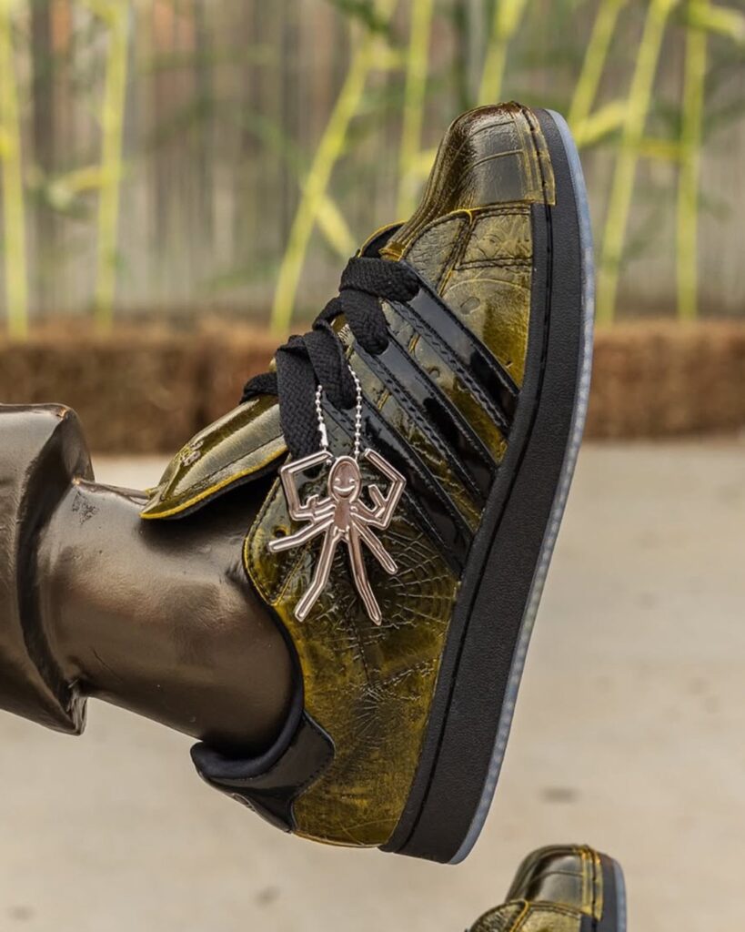 SP5DERのInstagramで初公開された第一弾モデルは、ダメージ加工を施したイエローグリーン系カラーのレザーアッパーに、光沢のあるブラックのパテントスリーストライプス、デザインを引き締めるブラックのミッドソールを採用。アウトソールには「555 555」と「SP5DER」の刻印が施され、シューレースにはSP5DERを象徴する蜘蛛の金属製チャームが揺れ、より反骨的な印象を演出している。通常モデルとは異なる質感と仕上げを融合させた独自性が際立ち、一目で識別可能なデザインは、限界に挑戦することを恐れないこのブランドにこそ相応しいだろう。