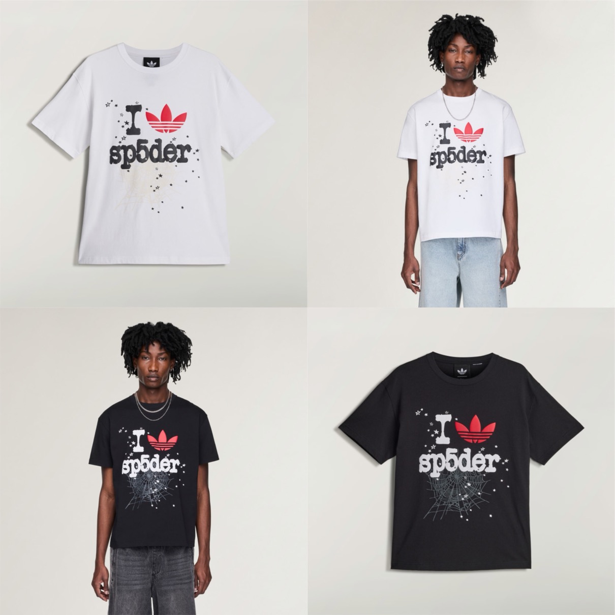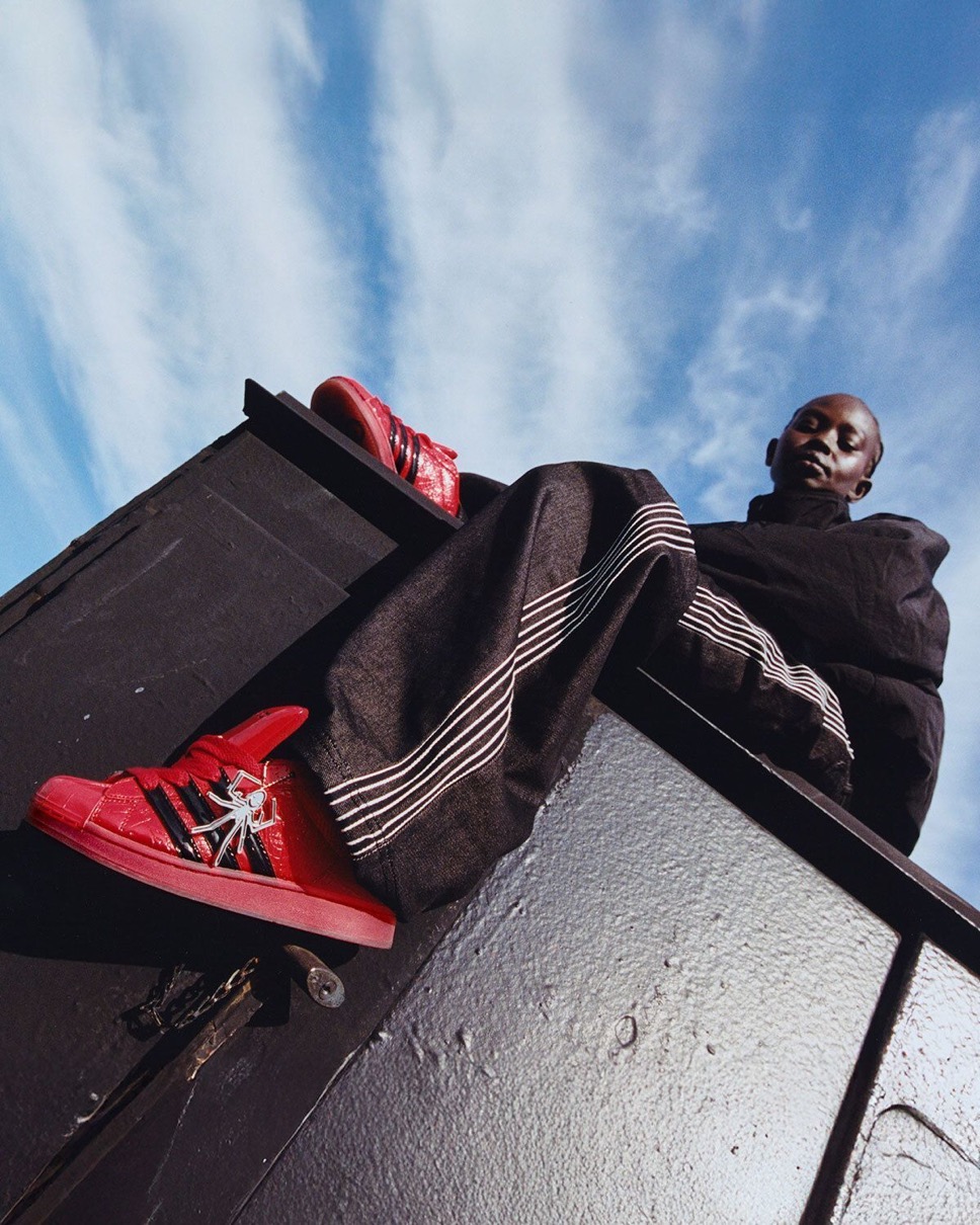 SP5DERとのコラボモデルは、テクスチャード加工を施したアッパーにスリーストライプスをあしらった一足。アウトソールには「555 555」と「SP5DER」の刻印が施され、シューレースにはSP5DERを象徴する蜘蛛の金属製チャームが揺れる。より反骨的な印象を演出し、通常モデルとは異なる質感と仕上げを融合させた独自性が際立つ。一目で識別可能なデザインは、限界に挑戦することを恐れないこのブランドにこそ相応しいだろう。カラーはグリーン、ブラック、スペイン代表のサッカー選手 Lamine Yamal(ラミン・ヤマル)が着用したレッド/ブラックの三色が展開。さらに、両者のロゴや蜘蛛の巣のグラフィックが特徴的なアパレルコレクションもラインナップ。