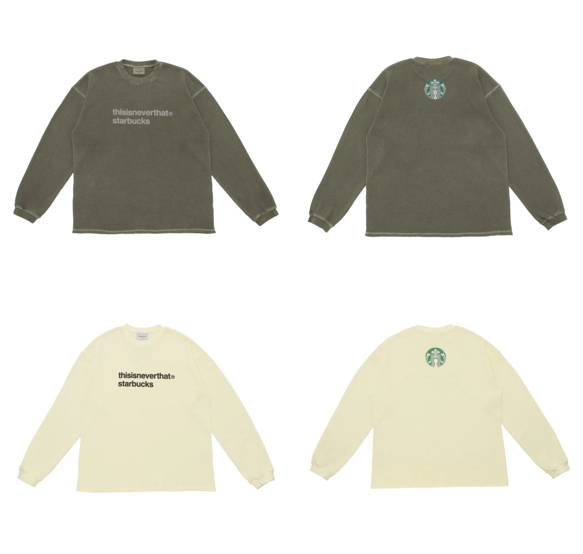 本コラボレーションのコンセプトは「neverthatcoffee」。両ブランドの想いが重なり合い生まれた「未完成だからこその自由さ」「同じ瞬間を共有することで生まれるコミュニティ」という考え方のもと、コーヒーをストリートスタイルの一部として取り入れる、新しいコーヒーの楽しみ方を提案する。ウェアにはthisisneverthatを象徴するワッフル素材やコットンジャージーを取り入れ、ガーメントウォッシュやピグメント染めを用い、着込んだような風合いを表現している。背面にサイレンロゴをあしらったアイテムも揃え、スターバックスらしいアクセントを添えています。サイズ展開はS~XLのユニセックス仕様で、スタイルに合わせて自由に楽しむことが可能。