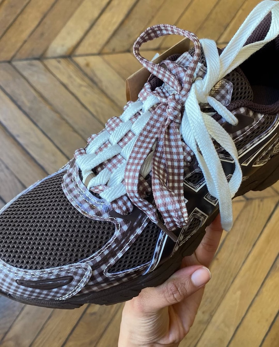 ワイルドフラワーが咲き乱れる広場で開催されたSTORY mfg. SS25 “Good Luck” Collectionで初お披露目された今作、今回ベースに採用された『GEL-VENTURE™ 6(ゲルベンチャー6)』は、都会を歩き回る人のために改良されたモデル。アッパーはインラインにはないダブルラッセルメッシュとギンガムチェックのオーバーレイで構築し、カラーはバニラ/ヴァイオレットクォーツとブラウンといった2つの組み合わせ。STORY MFG.の共同設立者Saeedが10代の頃バグダッドに住んでいた時に初めて目にしたスタイルにインスパイアされたデザインのシューレースはダブル仕様で、通常の紐に加え縦紐が編み込まれている。