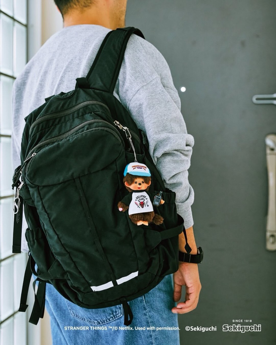 作品のダークな世界観を、モンチッチらしい愛らしいデザインで表現。「ヘルファイア・クラブ」Tシャツを着こなすモンチッチは、ホーキンス仲間との通信に欠かせないトランシーバーもしっかり装備。ダスティン愛用の“THINKING CAP”は、“MONCHHICHI CAP”としてロゴをオマージュしているのがポイント。ボールチェーン付きだからバッグに付けて一緒にお出かけもばっちり。さあ、いっしょに裏側の世界へ冒険に出かけよう。