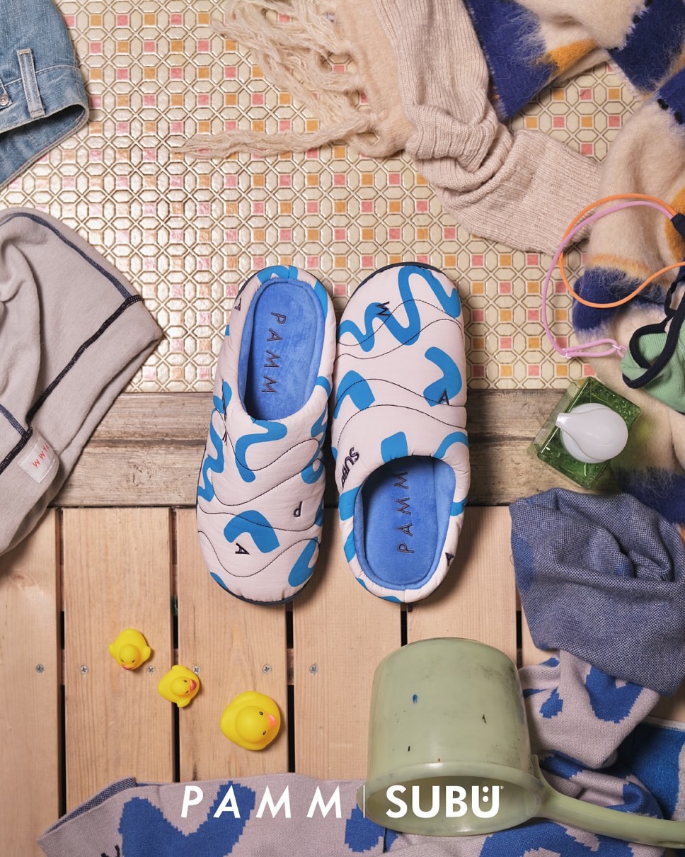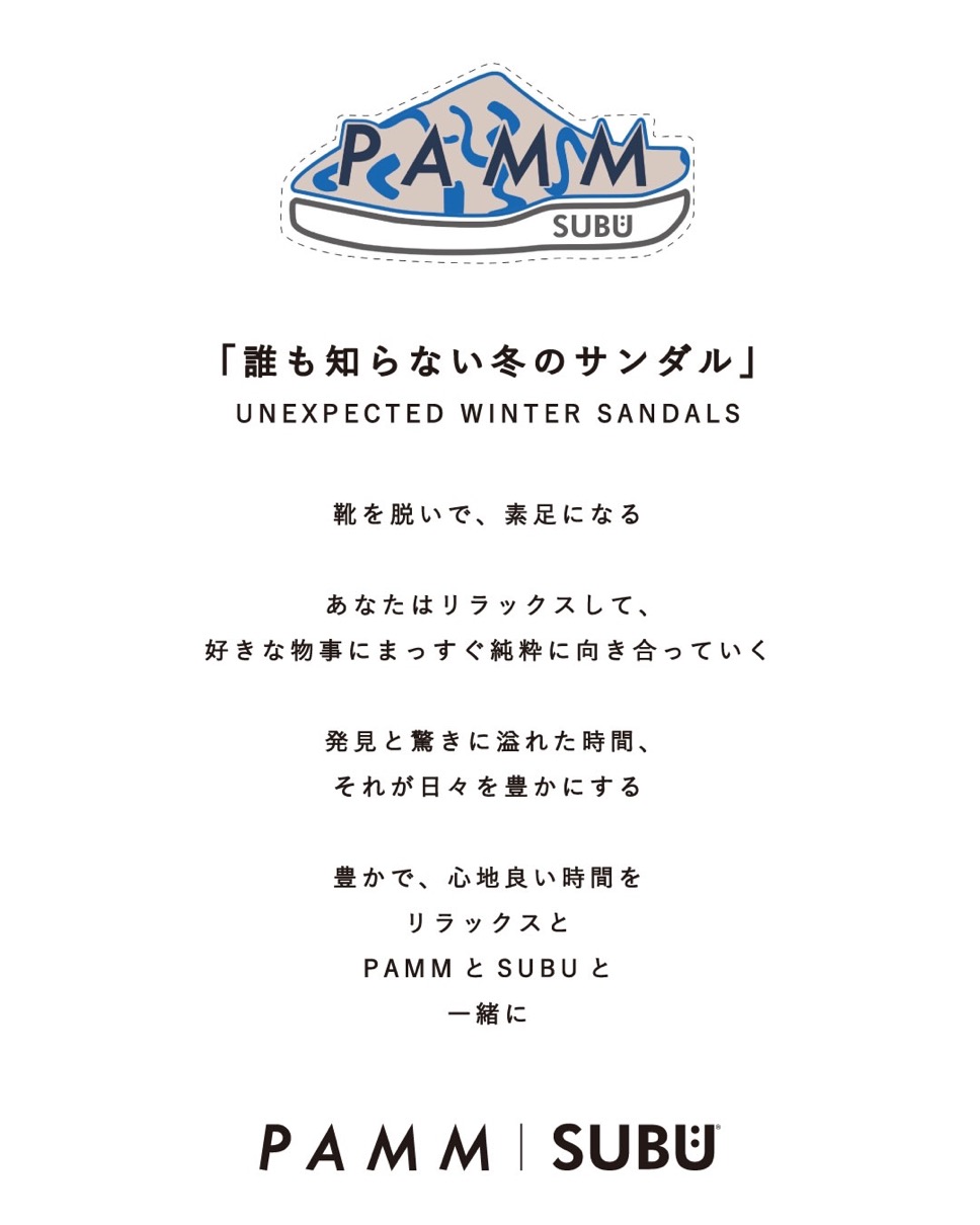 また、前回のコラボでご好評いただいた“thanks sea”シリーズも再販。なみなみ模様の柄位置はすべてランダムで、残布を出さないよう端から順に裁断するため、同じものが二つとない一点もののSUBUが出来上がった。また、今回のコラボを記念して、旗艦店PAMM家|表参道にてSUBUのスペシャルPOPUP STOREも開催決定。ホリデーシーズン限定で、PAMM家をSUBUが大胆に彩る。今回のコラボアイテムはもちろんのこと、その他インラインアイテムも展開する特別なイベントとなっている。冬の足もとにそっと寄り添う一足を探しに。“あなたのリラックス” を見つけに行こう。国内販売情報の追加など、新たな情報は判明し次第随時更新予定なのでお見逃しなく。