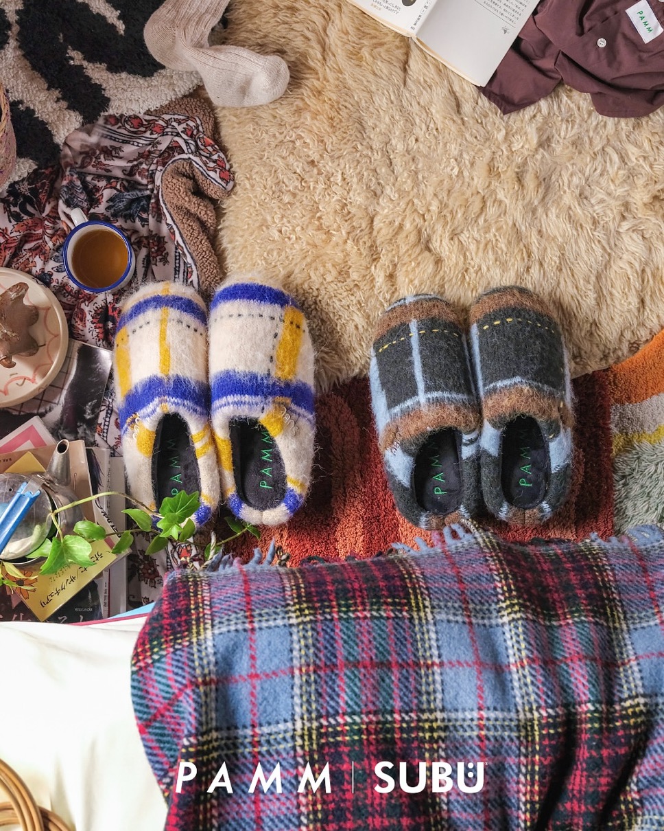 SUBUのブランドコンセプト『リラックスしている時こそ豊かな時間を過ごせる』にPAMMも共感共鳴し、東京発の温かさと暖かい心をかなえるコラボが実現。テキスタイルは代表的な“thanks sea”に加え、新たに“透明な空気のチェック”が登場。”透明な空気のチェック”は、澄んだ冬の空から生まれた大きなチェック柄。その線は、雲や新幹線、涙や鼻水、さまざまな情景が重なり合って生まれた、切ない心模様のようなテキスタイルだ。ふんわりと起毛した糸を使用し、冬らしいぬくもりのある一足に仕上がっている。