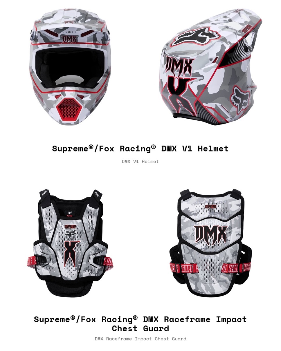 今週は、1974年にジェフ・フォックスが設立したモトクロスブランド「Fox Racing(フォックスレーシング)」とのコラボレーションアイテムが約2年ぶりに登場。本コレクションにはDMXレーシングジャージ、V1ヘルメット、レースフレームインパクトチェストガード、ボンバーグローブが含まれ、さらにダウンパファージャケット、フーデッドワークジャケット、セーター、長袖トップス、フーデッドスウェットシャツ、ジーンズ、スウェットパンツ、6パネルキャップ、ビーニーもラインナップする。