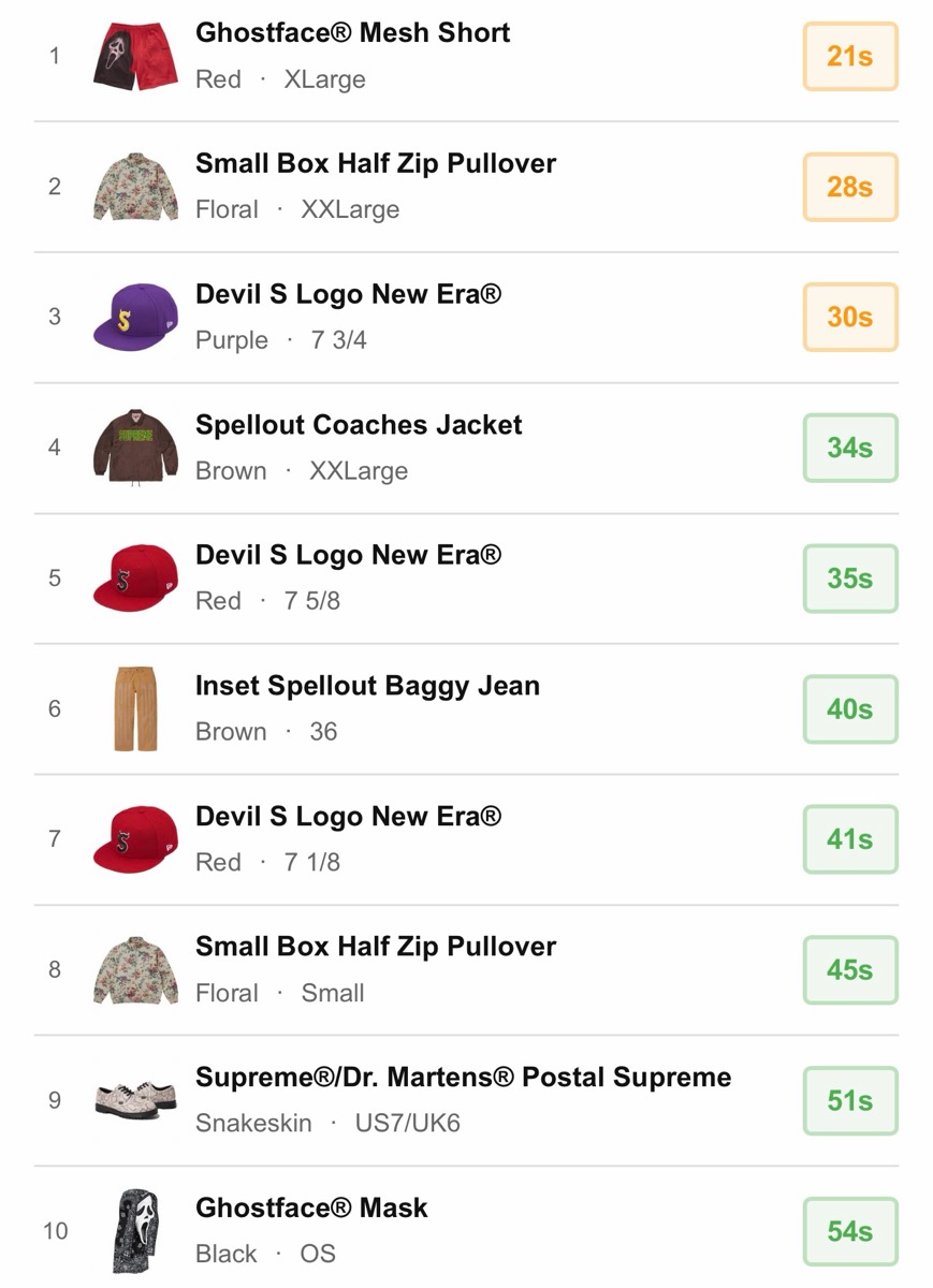 シュプリーム 2026年春夏コレクション WEEK10 海外オンラインの完売スピードランキングが公開。【2026SS】
