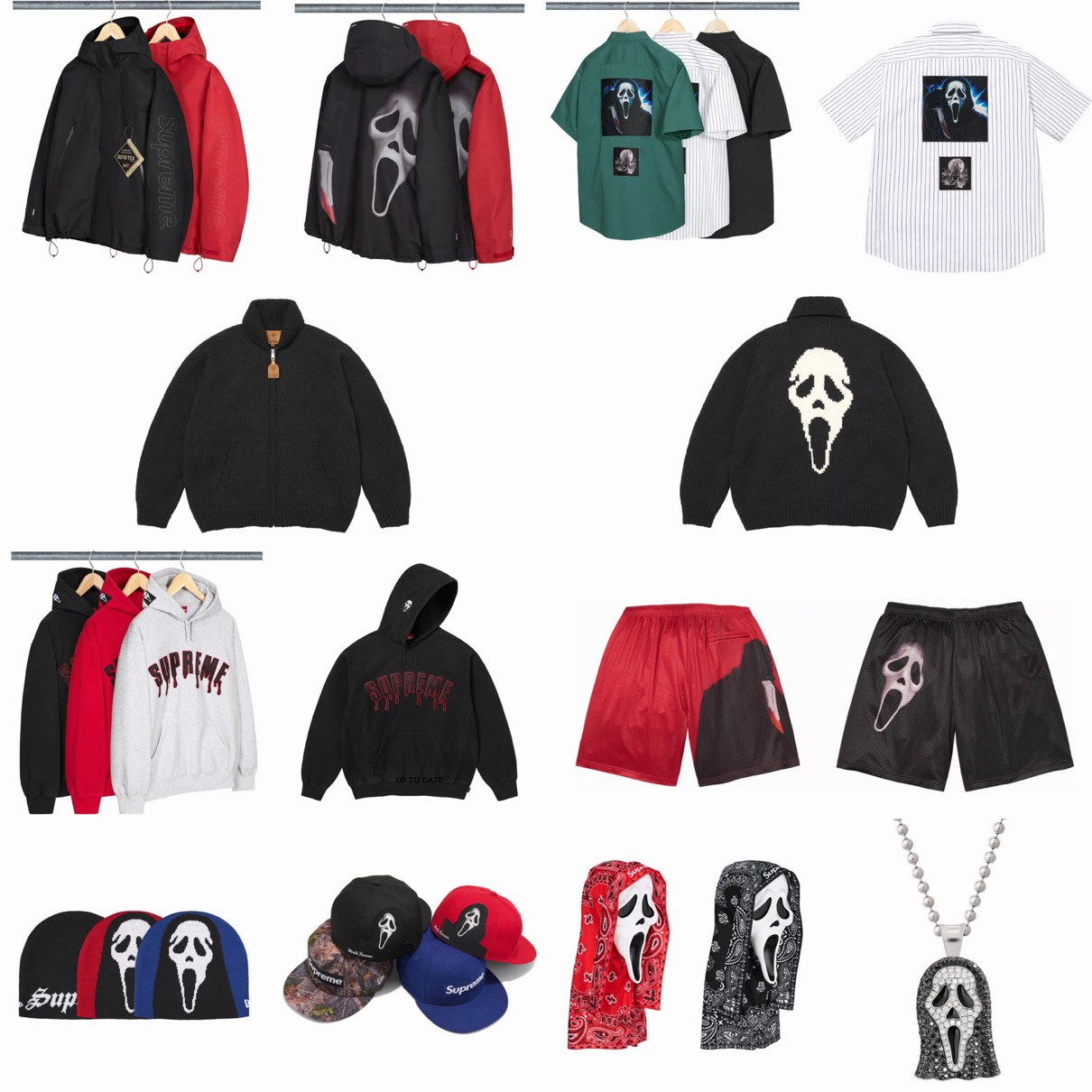 今週は、映画『スクリーム』でおなじみの架空の殺人鬼 Ghostface(ゴーストフェイス)とのキャラクターコラボが登場。GORE-TEXシェルジャケットやジップカウチンセーター、ワークシャツ、フーディー、ショーツ、ビーニー、ニューエラキャップ、フェイスマスク、Jacob & Co.(ジェイコブ&Co.)とのトリプルコラボダイヤペンダントなどがラインナップ。